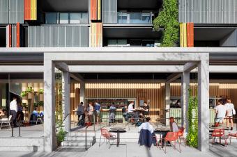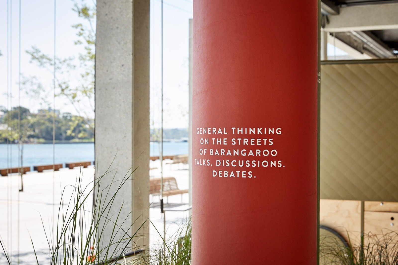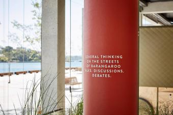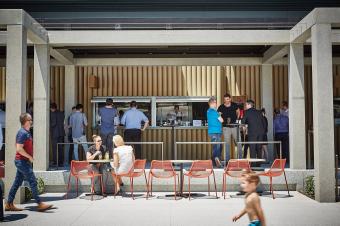 一位Barangaroo大使歡迎游客前往Food & Beverage Hub (美食中心)旁邊的Pop Up, 一群熱情好客的商家集中在這個(gè)專門設(shè)計(jì)的朝向?yàn)I水平臺(tái)開(kāi)放的紙管結(jié)構(gòu)中?!吧城稹钡撵`感來(lái)源于海岸邊界線,由階梯式座椅、公共看臺(tái)和本土品種的草地構(gòu)成,形成了一片起伏的景觀帶。