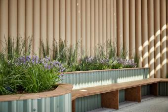▼休憩區(qū)中綠色植被環(huán)繞著長(zhǎng)椅