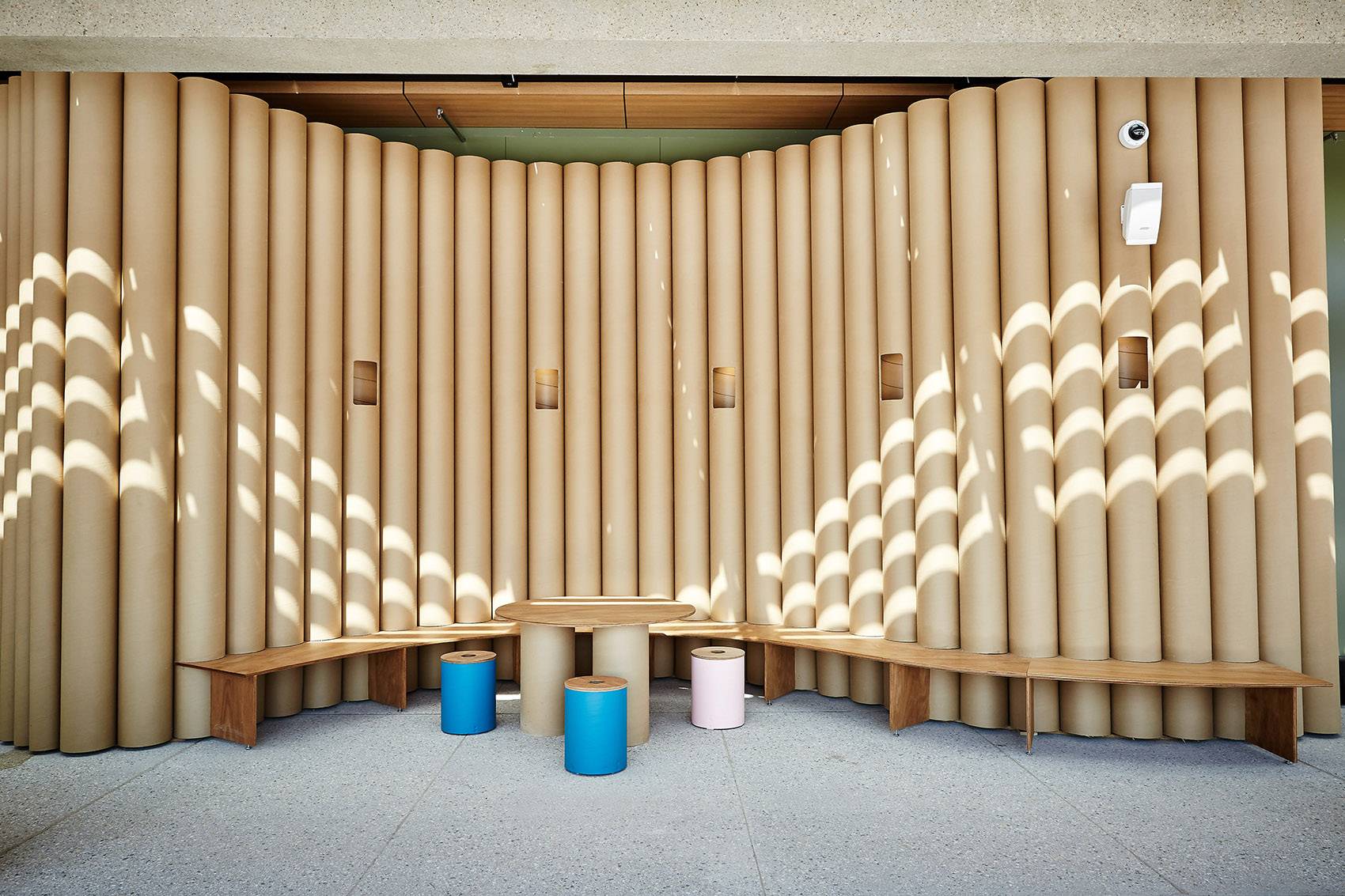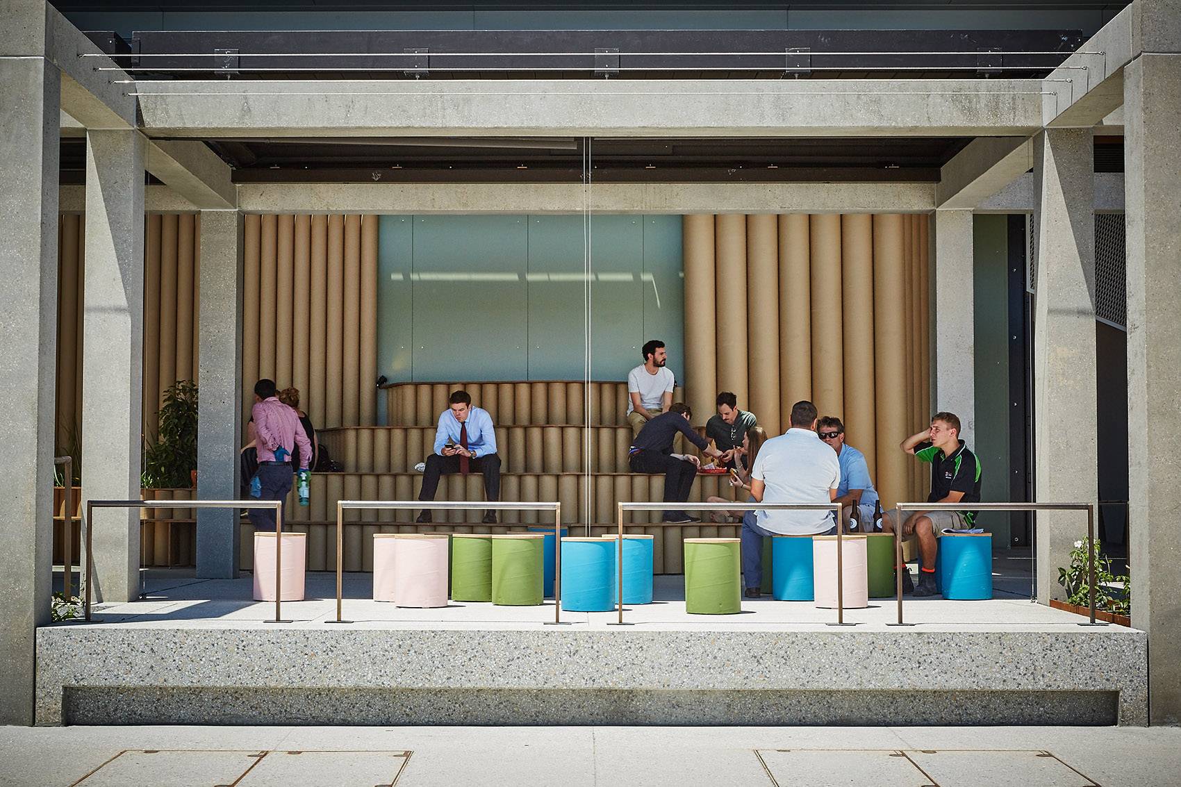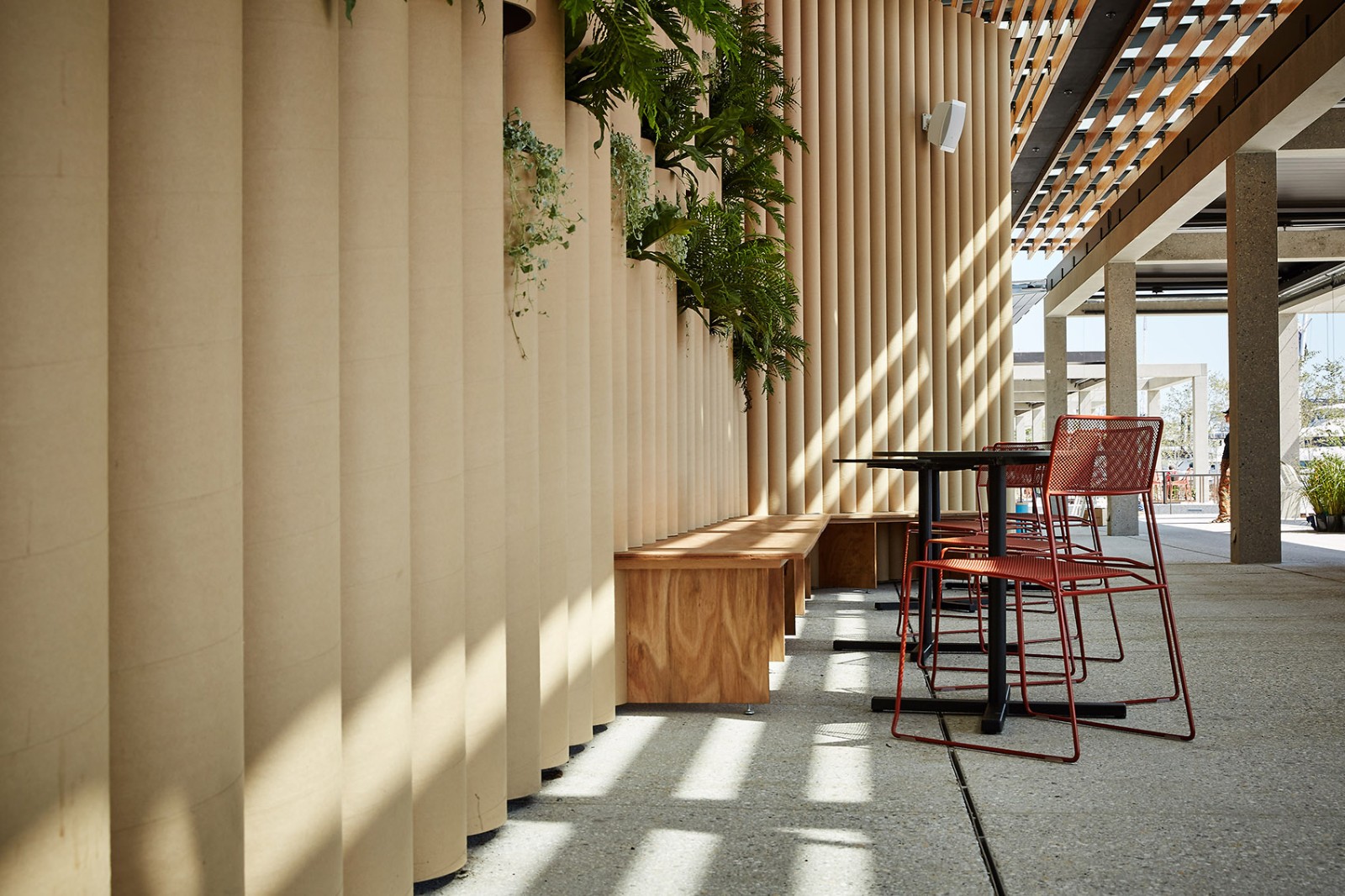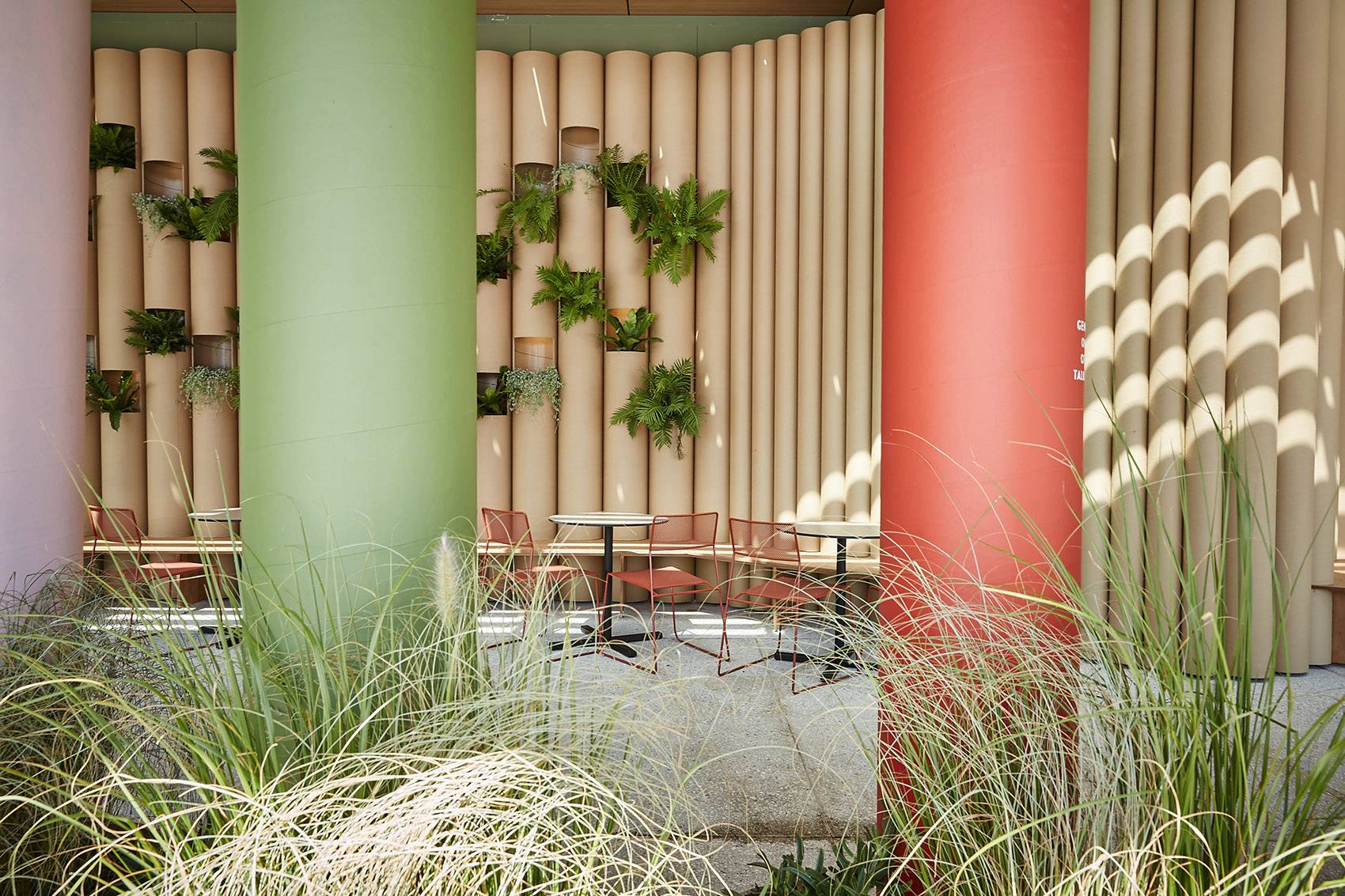 項(xiàng)目包括休閑區(qū)、戶外影院、景觀座椅、會(huì)議和共享工作區(qū)、活動(dòng)區(qū)域、借閱圖書(shū)館——所有的這些都圍繞著精心策劃的特別活動(dòng)開(kāi)展。大型景觀采用澳大利亞本土種類的植被,包括既巧妙又簡(jiǎn)潔的綠墻和一個(gè)可以用餐的花園,這兩個(gè)空間都設(shè)置于大尺度的紙管中。Foolscap的場(chǎng)地設(shè)計(jì)本質(zhì)是用回收材料創(chuàng)造有活力的臨時(shí)建筑、家具和功能元素、座位艙和本土植物花園。沿著長(zhǎng)廊布置有設(shè)計(jì)定制的食品車,可以供應(yīng)咖啡、冰淇淋和飲料。Foolscap還為項(xiàng)目設(shè)計(jì)了標(biāo)識(shí)和環(huán)境圖案。