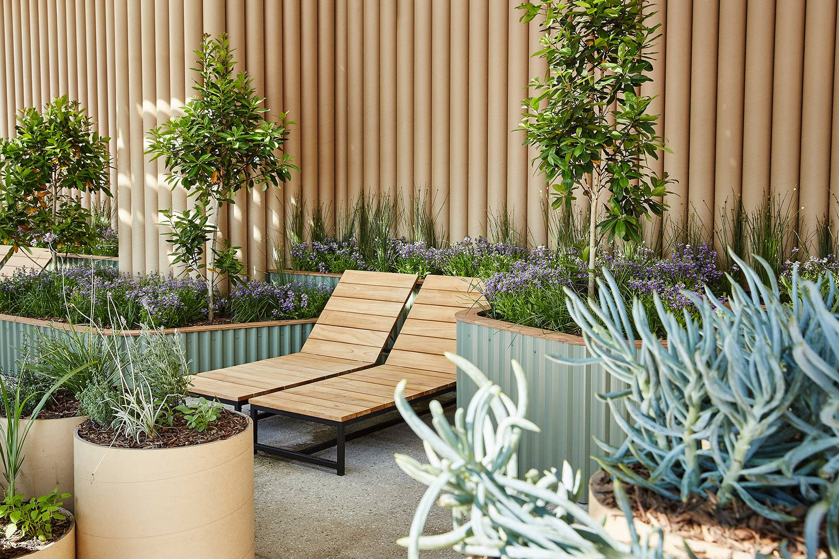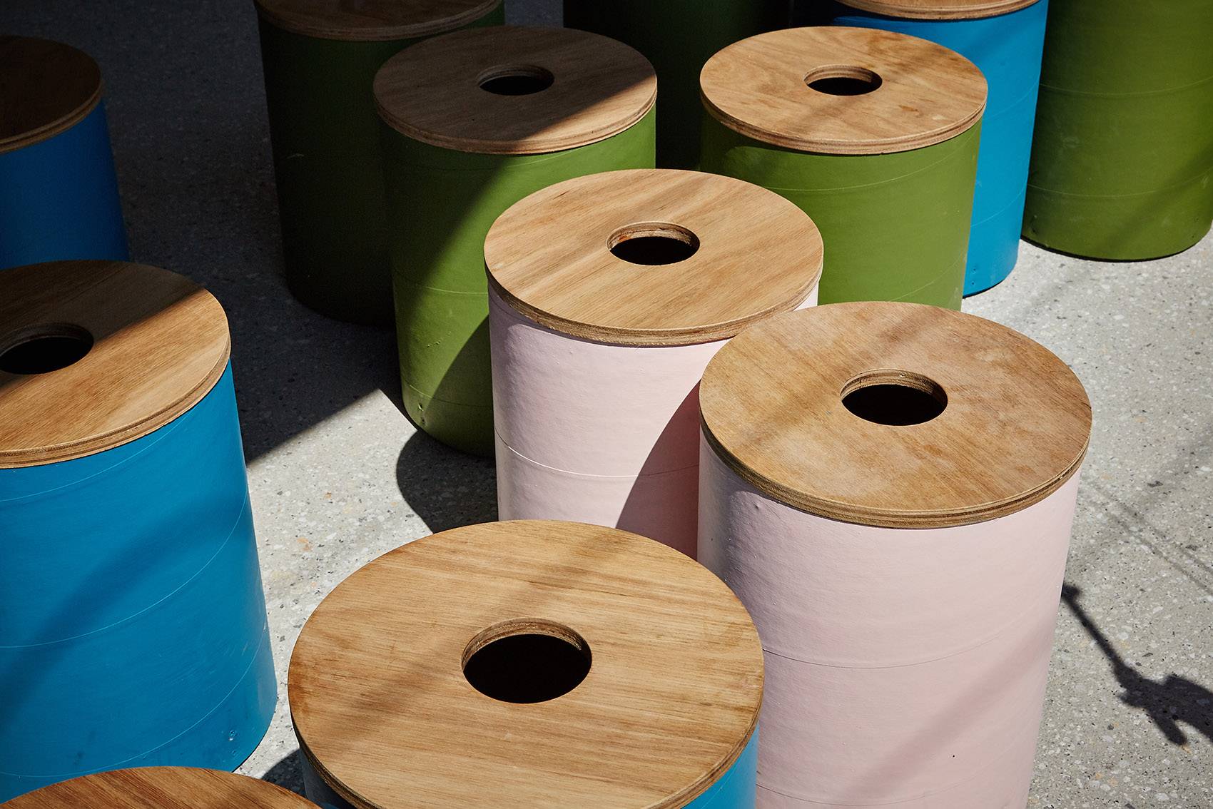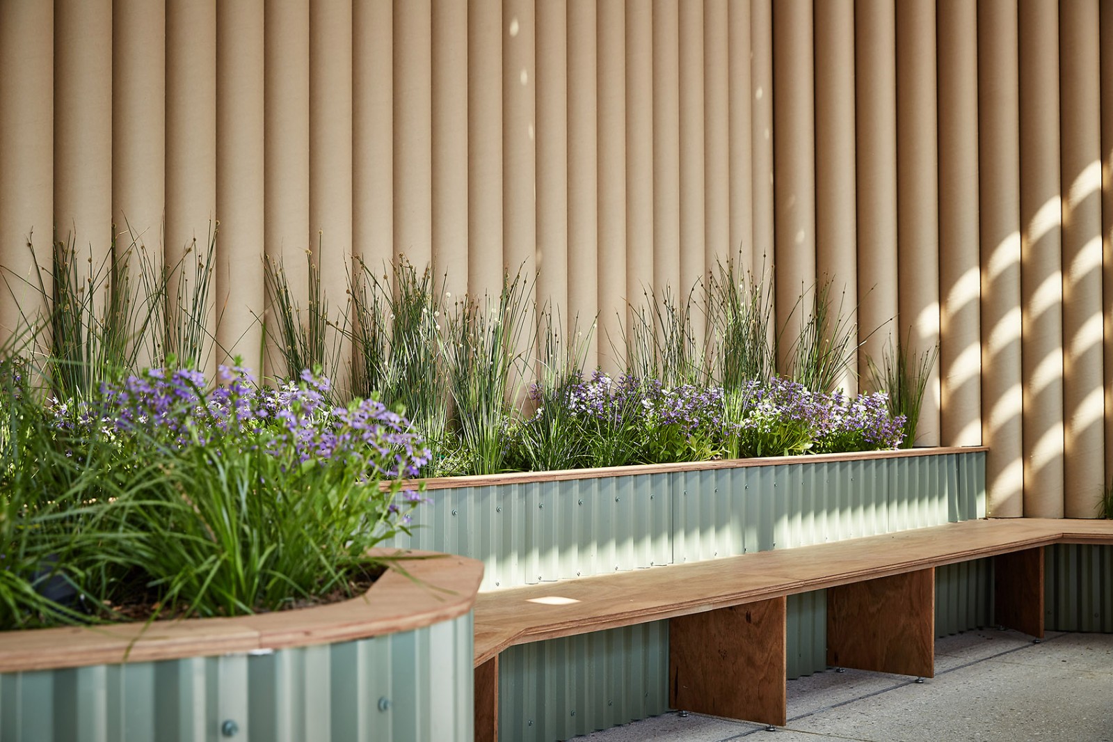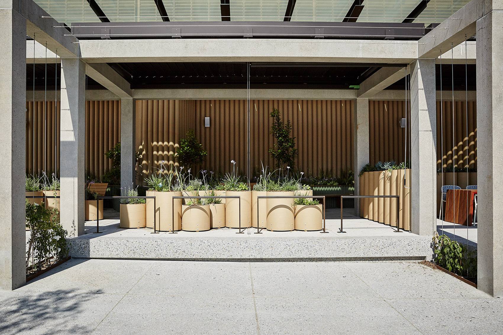 項(xiàng)目包括休閑區(qū)、戶外影院、景觀座椅、會(huì)議和共享工作區(qū)、活動(dòng)區(qū)域、借閱圖書(shū)館——所有的這些都圍繞著精心策劃的特別活動(dòng)開(kāi)展。大型景觀采用澳大利亞本土種類的植被,包括既巧妙又簡(jiǎn)潔的綠墻和一個(gè)可以用餐的花園,這兩個(gè)空間都設(shè)置于大尺度的紙管中。Foolscap的場(chǎng)地設(shè)計(jì)本質(zhì)是用回收材料創(chuàng)造有活力的臨時(shí)建筑、家具和功能元素、座位艙和本土植物花園。沿著長(zhǎng)廊布置有設(shè)計(jì)定制的食品車,可以供應(yīng)咖啡、冰淇淋和飲料。Foolscap還為項(xiàng)目設(shè)計(jì)了標(biāo)識(shí)和環(huán)境圖案。