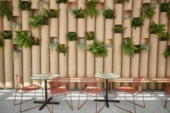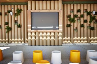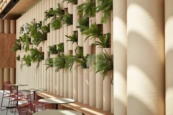共享工作區(qū)是一個(gè)供人們?cè)谵k公室之外會(huì)面、分享觀點(diǎn)和接觸新想法的公共空間。定制的設(shè)計(jì)家具和燈具安裝在紙管墻中,低矮的景觀墻內(nèi)種有多肉植物。屏幕區(qū)域是用于放映、演講和數(shù)字展覽的空間。休憩區(qū)域中有在綠色植物布置的長(zhǎng)椅,在Edible花園中,園藝愛(ài)好者可以在這里學(xué)習(xí)如何綠化城市空間。
