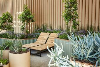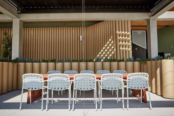▼連接花園的矮墻和一側(cè)長(zhǎng)桌會(huì)面區(qū)域