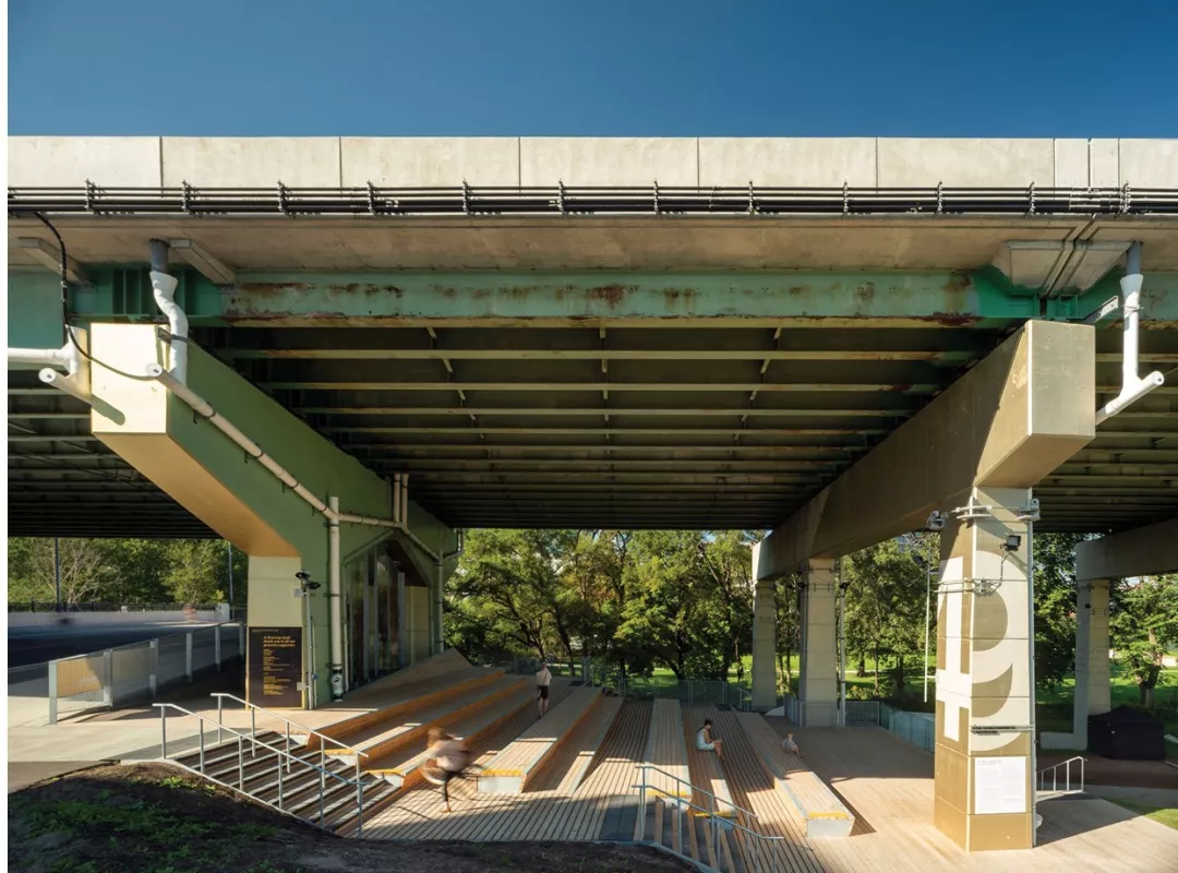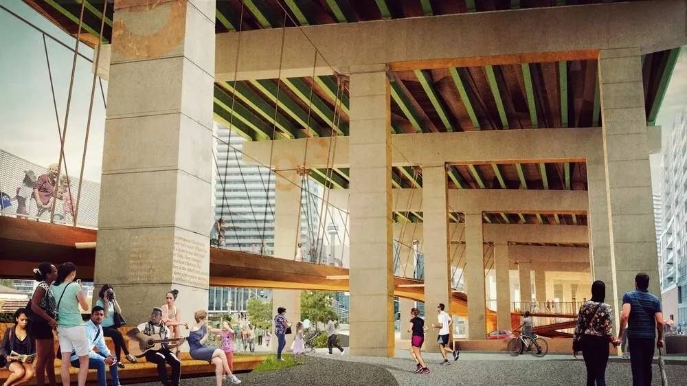 ▲Bentway二期將建設(shè)懸掛在高架橋上的木質(zhì)人行橋,溫暖的質(zhì)地與場地的工業(yè)化審美形成對比 ?PUBLIC WORK