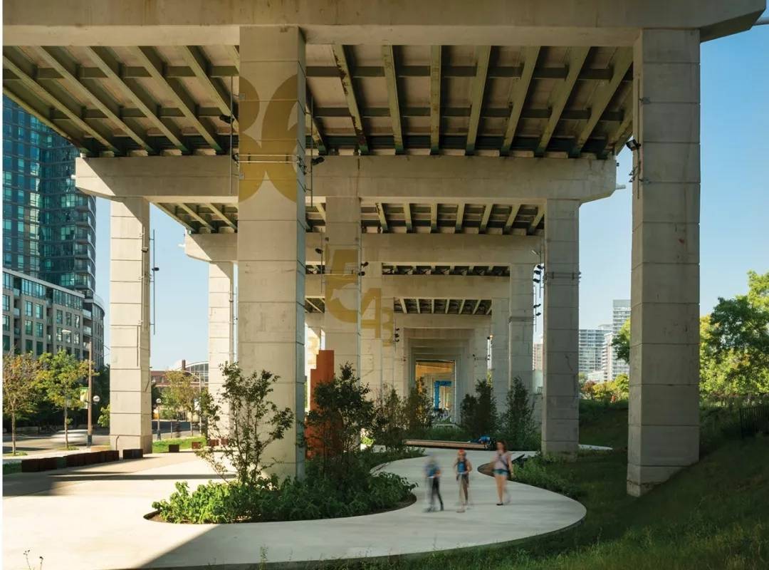 “Bentway重新構(gòu)建了多倫多Gardiner高速公路橋下的空間,將這塊城市中不受歡迎的地塊轉(zhuǎn)變?yōu)轶w現(xiàn)多倫多靈魂與精神的共享公共空間?;炷林纹鸶咚俟窐?,它們之間的空間則成為戶外空間、道路、以及社區(qū)活動和藝術(shù)創(chuàng)作場所。項目為打造連續(xù)且多樣的體驗,體現(xiàn)了大尺度的適應(yīng)性應(yīng)用,激發(fā)周邊七個社區(qū)居民的積極參與,并能為多種活動提供空間。它創(chuàng)新的雨水管理方法使這一新建的公共空間協(xié)助城市環(huán)境和市民生活的可持續(xù)發(fā)展。”