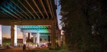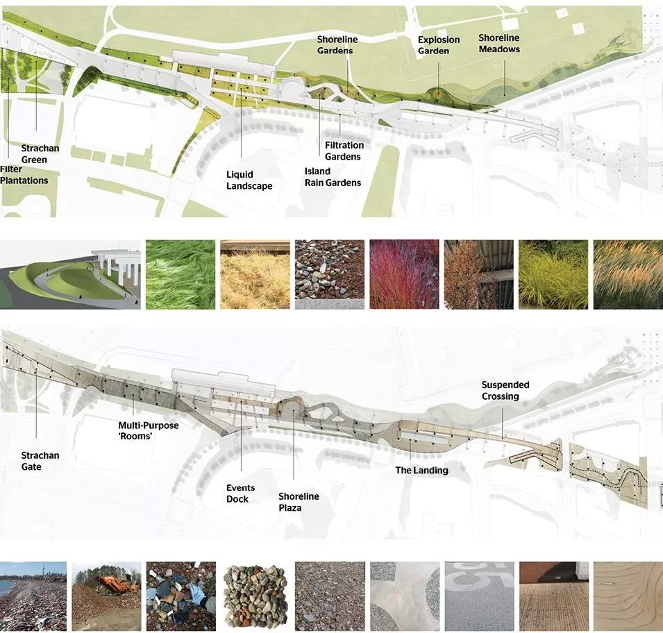 Strachan Gate包含一個高度靈活的戶外劇場和露臺,階梯狀的黃色雪松木看臺,以及一系列可旋轉(zhuǎn)的背景板,用來屏蔽道路噪音。其下方還加入了公用衛(wèi)生間和表演者的更衣室。與其相連的傾斜圓形劇場草坪能夠容納更多人,大型的表演和節(jié)慶活動也可以在此舉行,而草坪的地形塑造完全使用原地挖掘的材料。約克堡游客中心前長72米的雪松“碼頭”則提供了另一處節(jié)慶空間,它旁邊是由本地草本植物和雨水花園構(gòu)成的“流動景觀”,用來處理雨水徑流。