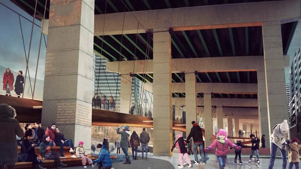 項目第一期中的標志性景觀是長約220米的冬季溜冰道,夏季則變成孩子們的戲水道,為這條被城市遺忘的道路增添意義和體驗。多倫多市民非常了解生活節(jié)奏如何隨季節(jié)而變化,溜冰道體現(xiàn)了與冬季共生的理念,頭頂?shù)腉ardiner高架橋保護了橋下空間,對抗多倫多寒冷的北方氣候。