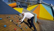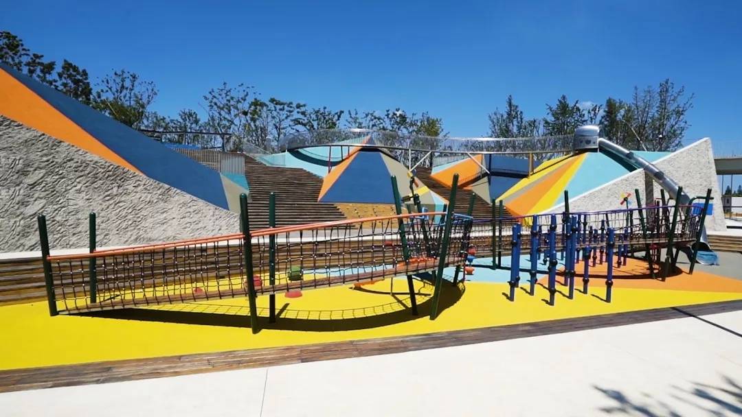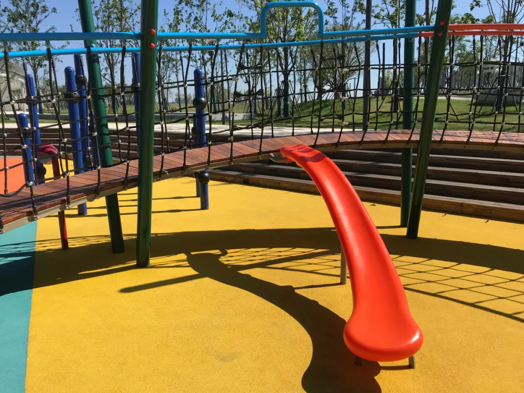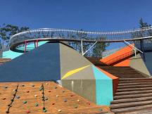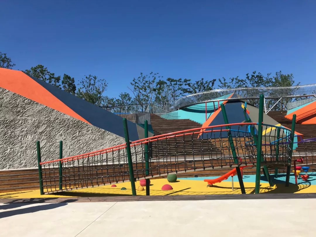 我們?cè)谶@里有給低齡兒童的游樂(lè)設(shè)施,有給大齡兒童的游樂(lè)設(shè)施。同時(shí)還考慮到小朋友們可以探險(xiǎn),在這座多彩的山丘上我們可以攀爬、滑行。這一切游戲都有極大的安全保障,所有的地面都做成了軟的地面,摔倒時(shí)不太疼,站起時(shí),把身上清理干凈,是非常非常容易的。我們的目的就是在最大的安全保障下,讓孩子們最大限度地玩耍,甚至,我們期待小朋友們?cè)谶@里創(chuàng)造自己的小世界。我們把游樂(lè)區(qū)做成現(xiàn)在這樣的形狀,充滿(mǎn)各種顏色,分割成多個(gè)小區(qū)域。