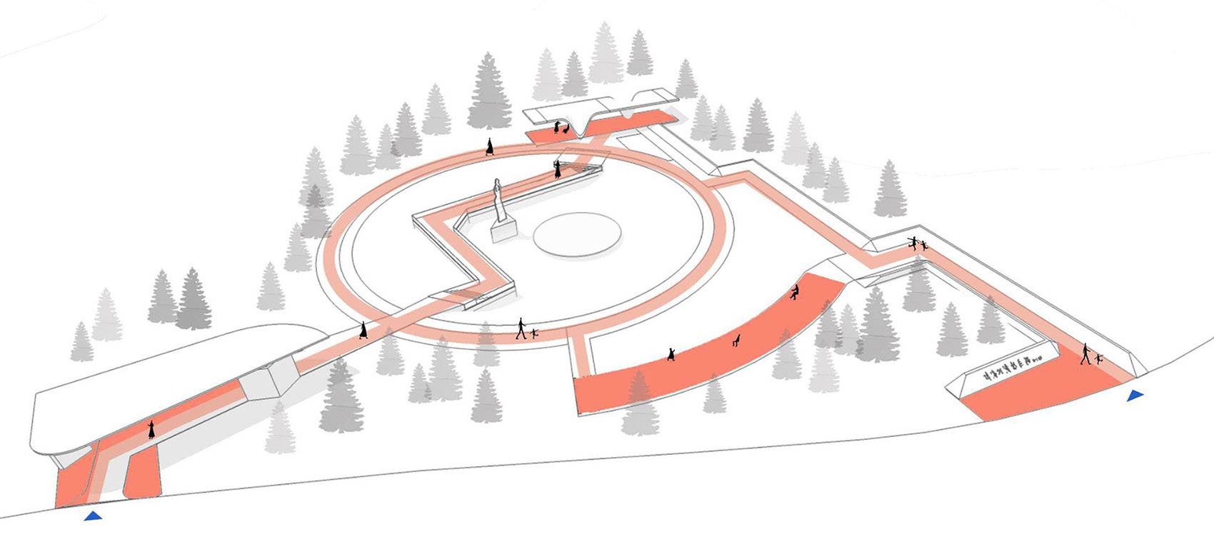 ▼在主入口通過一系列不斷轉(zhuǎn)折的路徑建立起“駐足”、“浸入”兩條完全不同體驗的動線