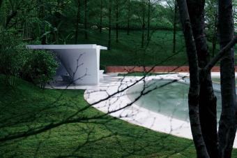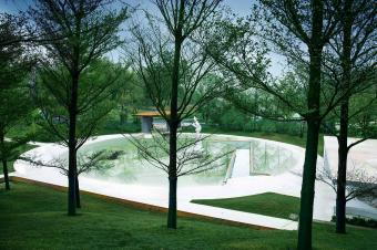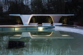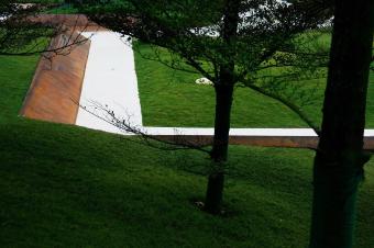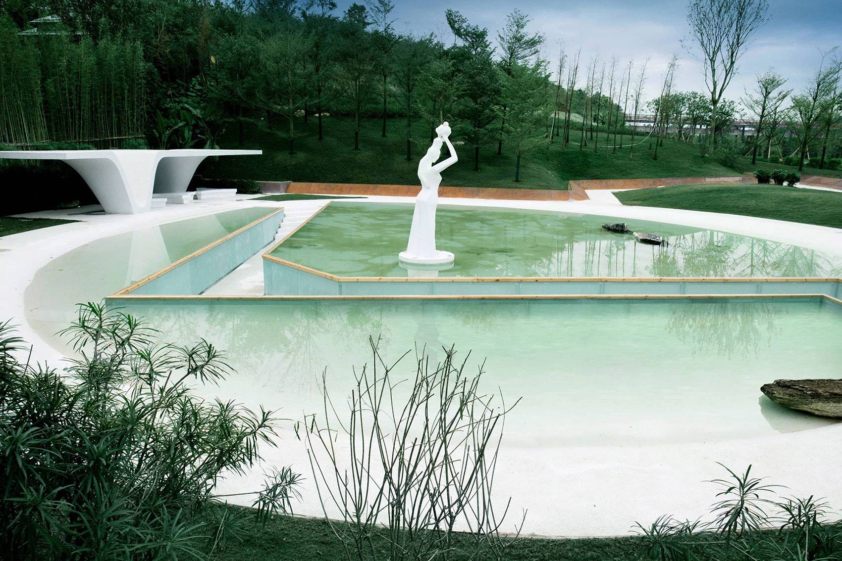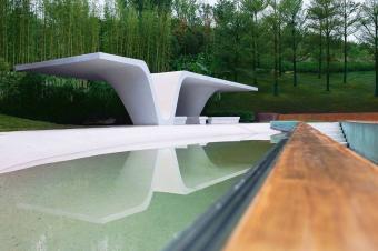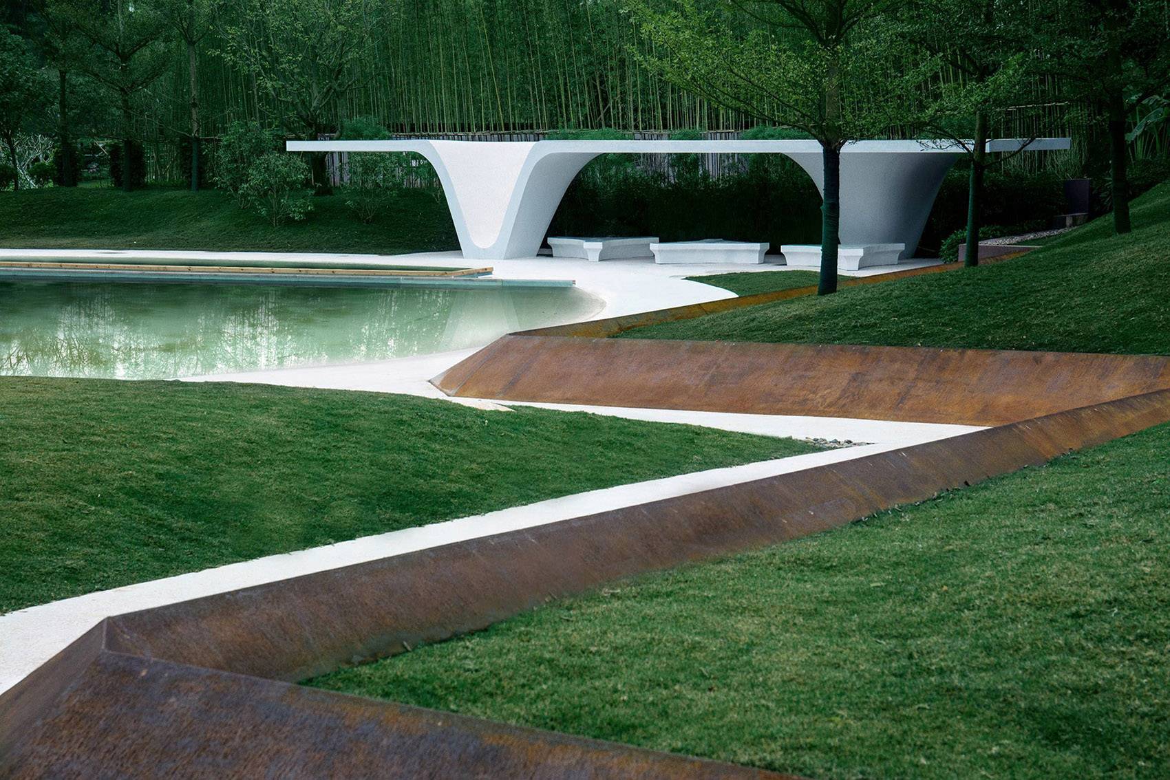 “浸入”動線是一個讓使用者不斷接近中心水池的步道,步道的最東側(cè)以一座與地面形成完整連接的景觀亭作為整個展園的東側(cè)邊界。設(shè)計讓景觀亭不僅是場地的一個邊界,同時更是場地的延伸。為了進一步建立起人與水、路與橋之間相互浸入、相互曖昧的關(guān)系,步道北側(cè)進入的過程中進行了下沉的處理,從而創(chuàng)造出了一個緩緩下降、可以觀望到水池底部的獨特體驗。這一類似展示設(shè)計室內(nèi)空間的手法也將更多的融入未來地產(chǎn)景觀示范區(qū)的有限空間當中。包羅萬象的空,為高強度的形式操作提供了合理性和可操作性;包羅萬象的空,在建立起場地豐富性的同時保證了空間的完整性和純凈感。