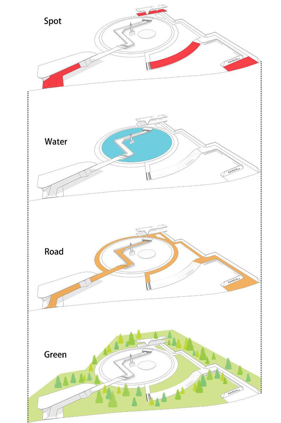 因此,這一次的設(shè)計研究上采用了“包羅萬象的空”進行應(yīng)對,旨在通過極度克制的語言和材料,結(jié)合多樣的功能,單純對場地進行傾斜、折疊、延展、剪切、凸現(xiàn)、凹陷、隆起、斷裂、包裹等人為動作的重塑,以創(chuàng)造出一種兼具高純度體驗和高活力指數(shù)的場所。整個珠海園占地2100平方米,場地自身的高差并不明顯,只在南側(cè)和西側(cè)有一座高約40米的山體,這兩側(cè)的山體對整個場地進行了適當?shù)膰希灿纱俗寛龅馗鼮閮?nèi)向。在主入口通過一系列不斷轉(zhuǎn)折的路徑建立起“駐足”、“浸入”兩條完全不同體驗的動線,這對于未來地產(chǎn)景觀的示范區(qū)項目的動線體驗設(shè)計具有重要的借鑒意義,嘗試單個項目多重路徑體驗。