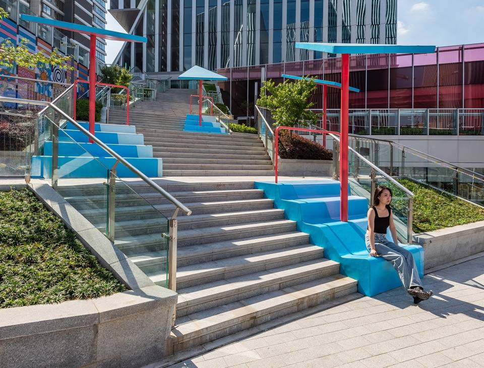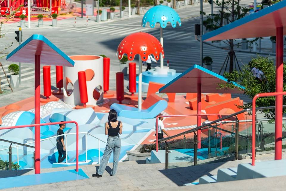 由此產(chǎn)生的設(shè)計被渲染為街道上的一個游樂場,充滿了一些基本的幾何物體,如氣泡和將被兒童占領(lǐng)的波浪。除了為成年人提供的陰影座椅外,還有一個時髦的樓梯,將一個循環(huán)空間變成了一個可以停留、休息、躺下和凝視城市飛地的空間。