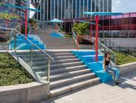 該項目包括連接街道水平面,商業(yè)建筑公共屋頂?shù)臉翘菀约敖值浪矫嫔系闹憛^(qū),試圖通過引人注目的設(shè)計將兩層連接起來,這也可以鼓勵游客將樓梯用作公共空間。