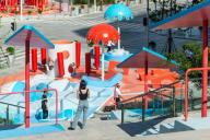 樓梯上灑滿了“水滴”——不同類型的迷你論壇,經(jīng)過精心設(shè)計,提供了一系列可以俯瞰整個中央交叉廣場的不同的座位和休息室位置。這些“水滴”會在底部著陸區(qū)形成一個“水坑”,為年輕游客提供一個具有有趣功能,可以作為游戲景觀的娛樂池。娛樂池包含一個障礙道和一個虛擬游泳池,具有有趣的功能作為游戲景觀。