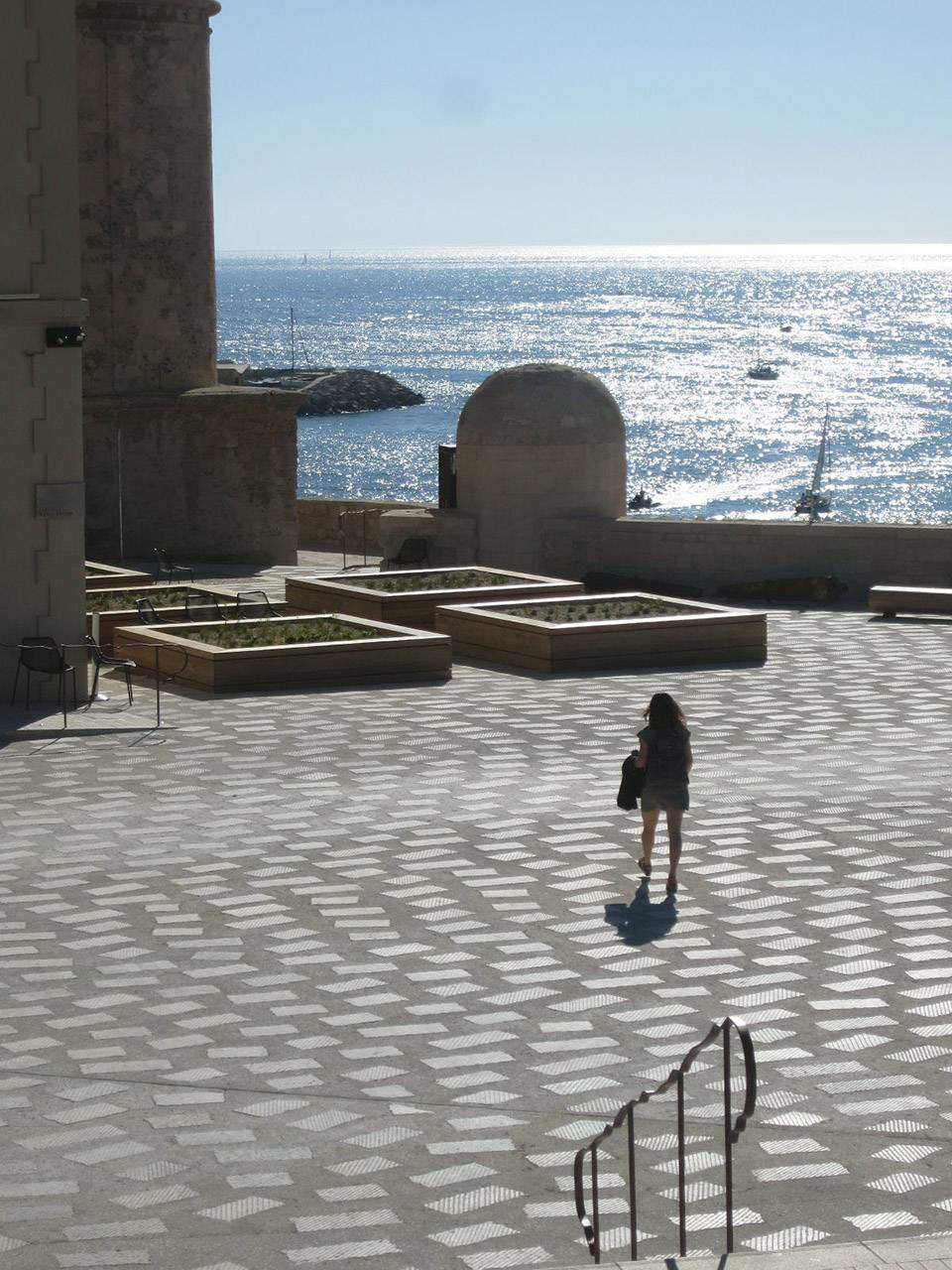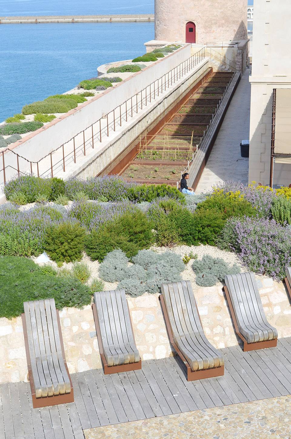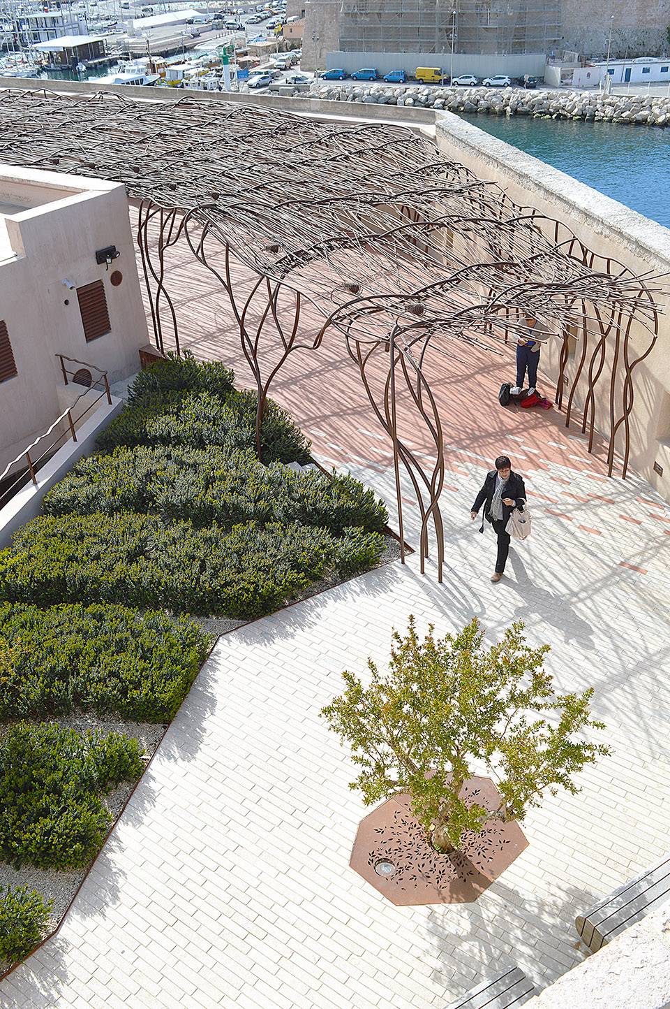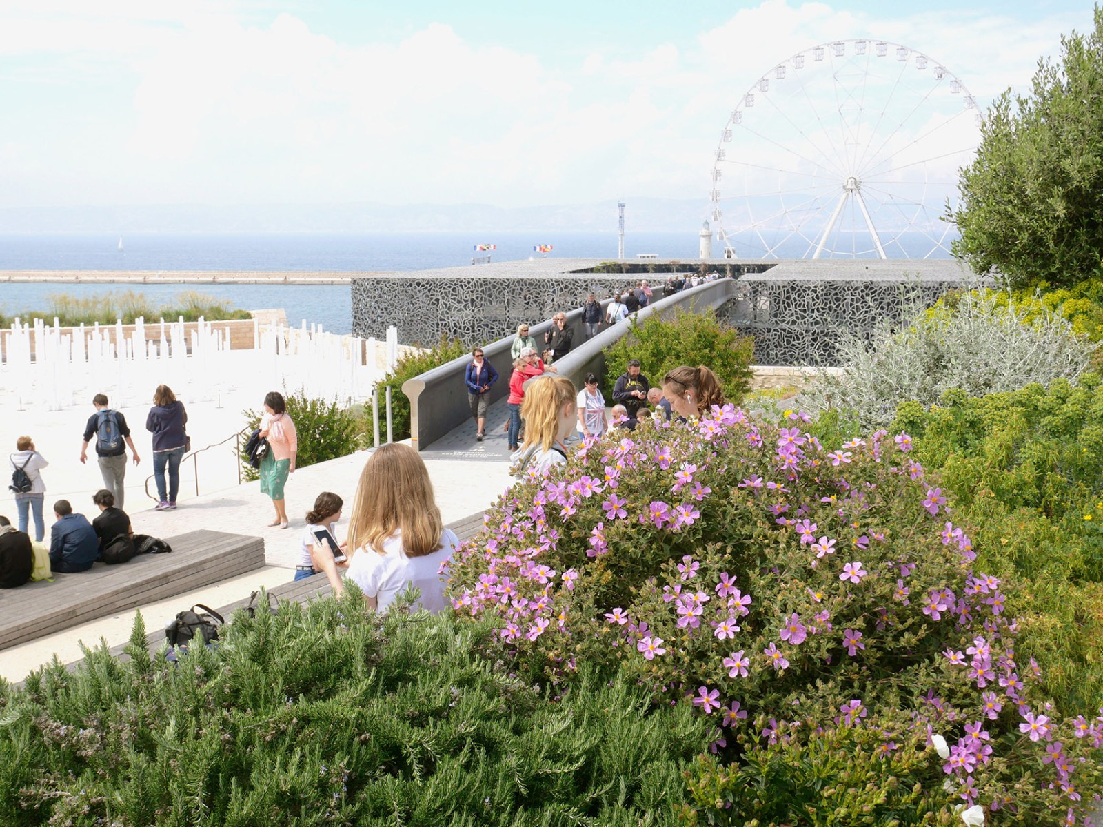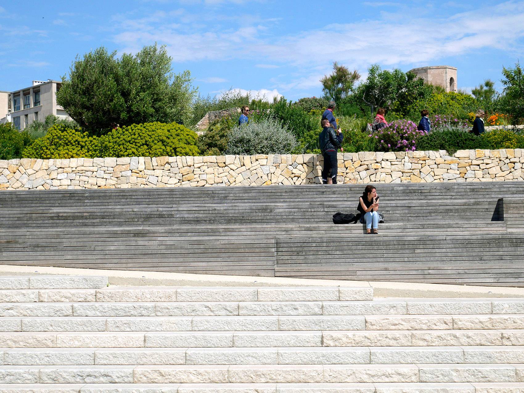 地中海民族植物學(xué)之旅空間將其花園空間延伸到了路堤的斜坡上。這個(gè)斜坡與d’Armes廣場(chǎng)西側(cè)人行步道的直線距離超過200米,享有馬賽市及其地標(biāo)性建筑(如大教堂主樓和圣羅蘭教堂等)的絕佳景觀視野。花園中種植著一系列穆斯林和猶太基督教文化中常見的傳統(tǒng)植被,這些植被如同壁畫一樣,為游客們提供了一個(gè)近距離接觸和體會(huì)地中海民族文化的機(jī)會(huì)。