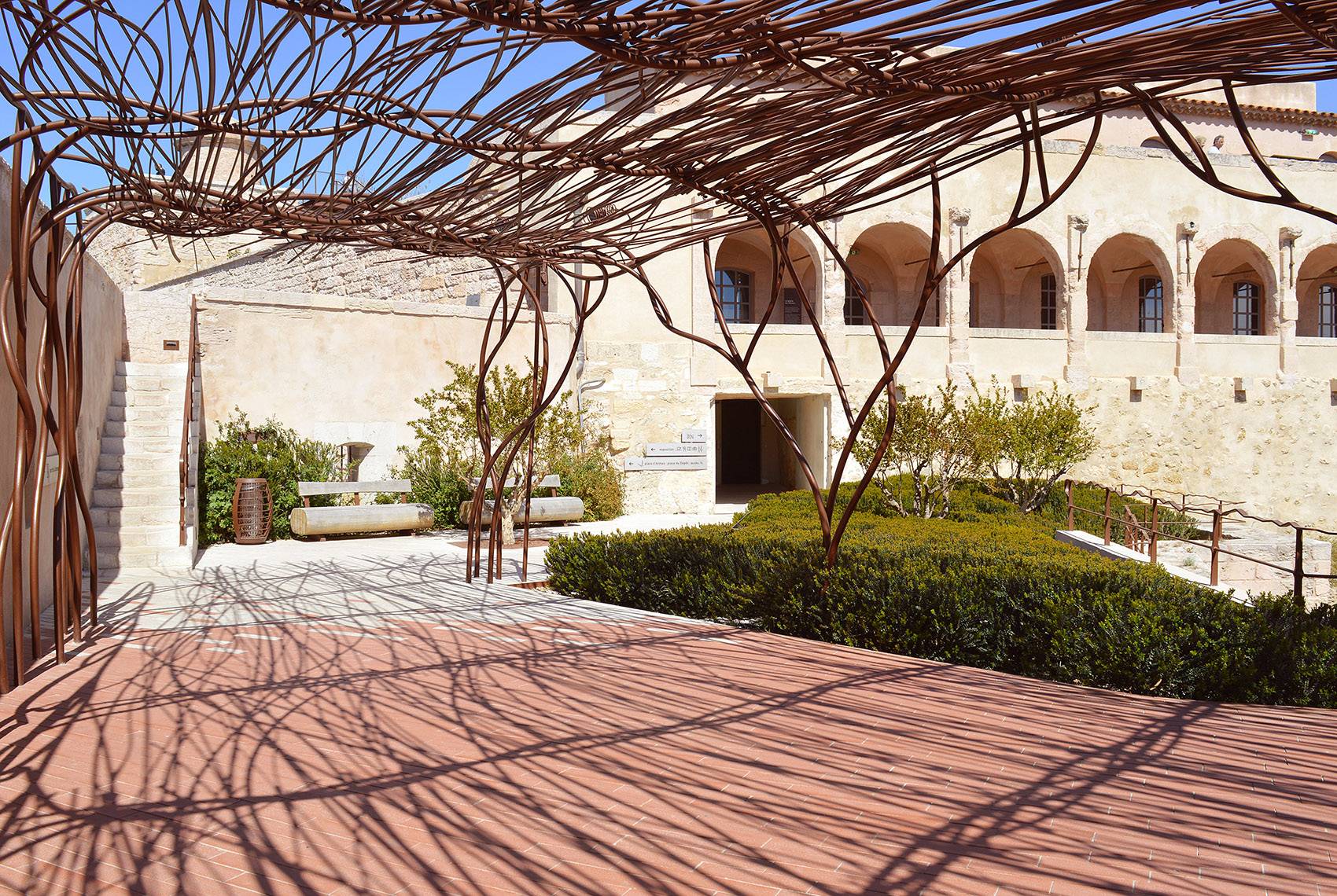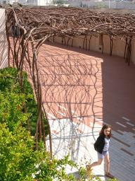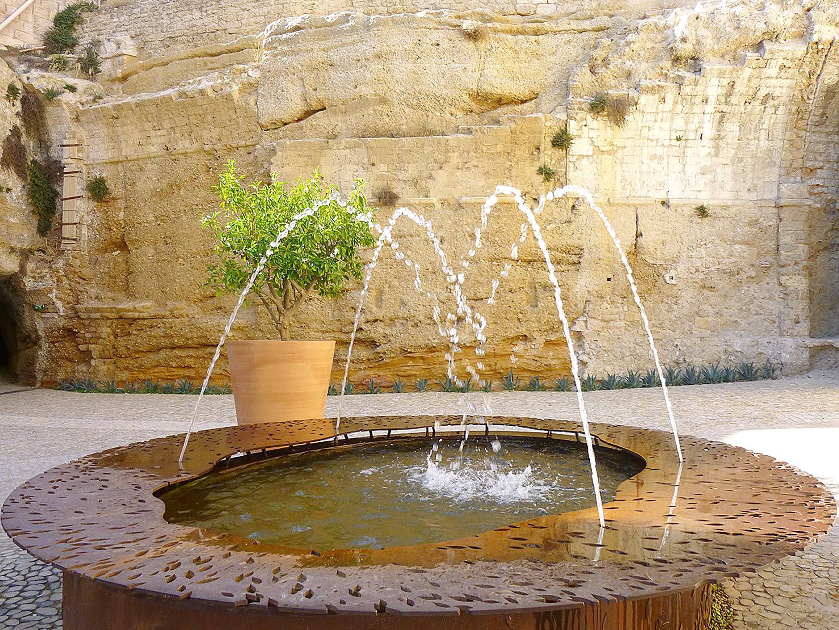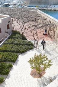 默特爾庭院位于光影畫廊的出口附近,地理位置絕佳,游客們可以在此俯瞰種植著橘子樹的入口庭院。庭院面積不大,設(shè)計(jì)團(tuán)隊(duì)在里面種上了桃金娘科植物。這一設(shè)計(jì)其實(shí)非常巧妙,因?yàn)楫?dāng)人們?cè)谛闹心钪医鹉镞@個(gè)名字的時(shí)候,腦海中就會(huì)不禁地浮現(xiàn)出格拉納達(dá)(Granada)的阿爾罕布拉宮(Alhambra)?;▓@的一側(cè)鋪設(shè)著石灰石路面,一個(gè)小型的樓梯直接將西墻邊的步道與通向載人電梯的小路連接了起來(lái),以便于行動(dòng)不便的游客去往下層空間的指揮官畫廊?;▓@的另一側(cè)整齊地排列著繁茂的桃金娘科植物和石榴樹,在視覺上強(qiáng)調(diào)了花園絕佳的地理位置:它就像是一個(gè)陽(yáng)臺(tái),不僅靜靜地懸浮在庭院、廣場(chǎng)高塔、背景中的教堂和Ailantes花園的上空,更提供了城市和港口的局部景觀。