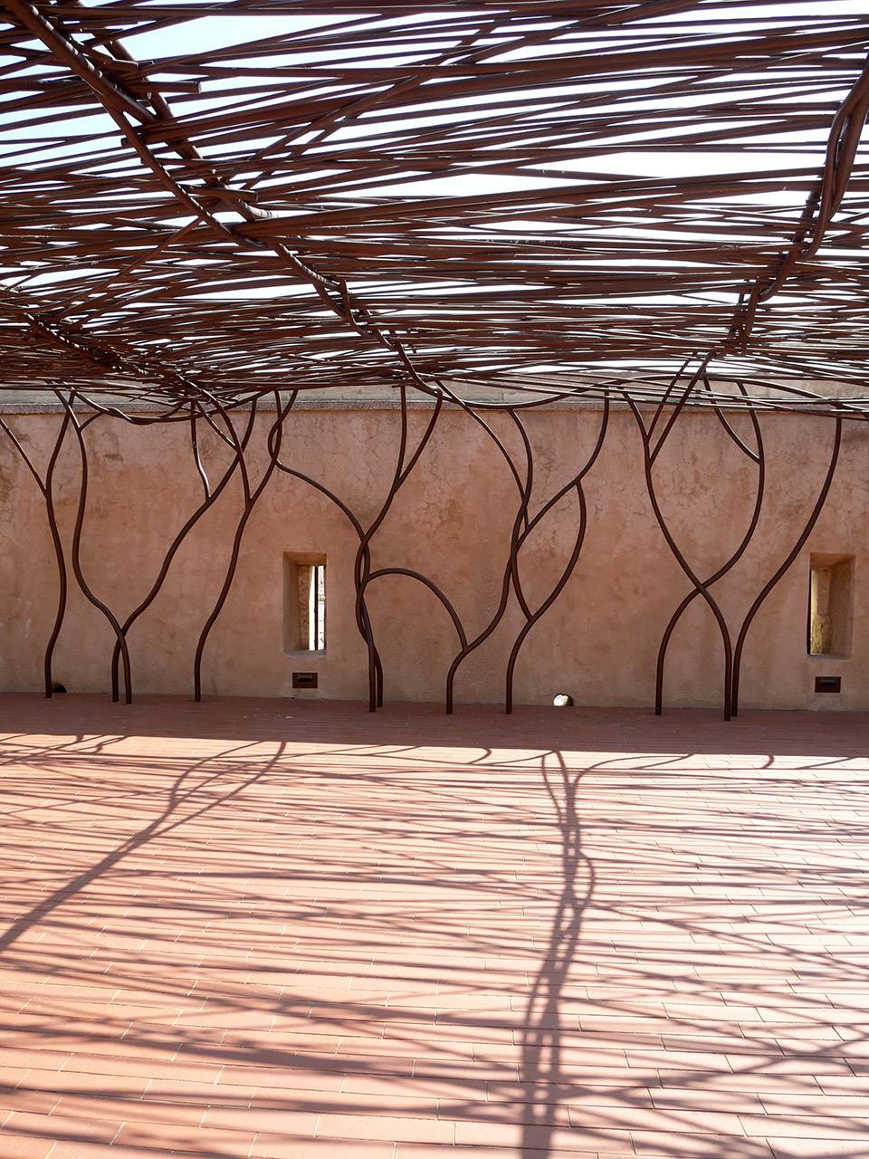這個(gè)露天的屋頂畫廊采用赤土色的地板,不僅是進(jìn)入前指揮官花園——“默特爾庭院(myrtle yard)”前的最后一個(gè)前廳式空間,更可以作為一個(gè)室外的展覽空間,展出Mucem的部分藏品。