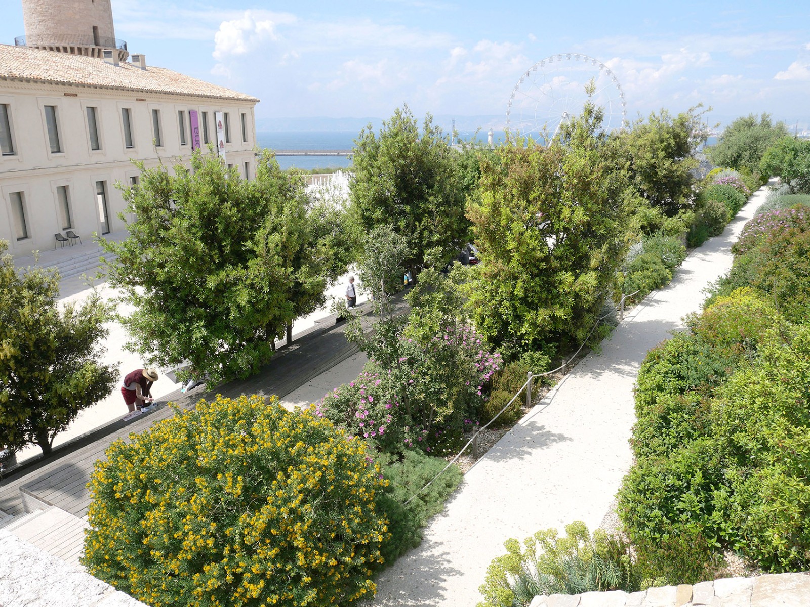 在咖啡館露臺(tái)和Georges Henri Rivière大樓的后方設(shè)置著一個(gè)地中海式的菜園。這個(gè)方形的菜園沿著防御工事景區(qū)的西墻布置,向北一直延伸到信標(biāo)塔附近。菜園內(nèi)種植著各種當(dāng)?shù)鼗蛲鈦?lái)的蔬菜,這些蔬菜按照顏色的順序排列,無(wú)論是在冬季還是在夏季,都在向人們展示著地中海特有的植物文化。