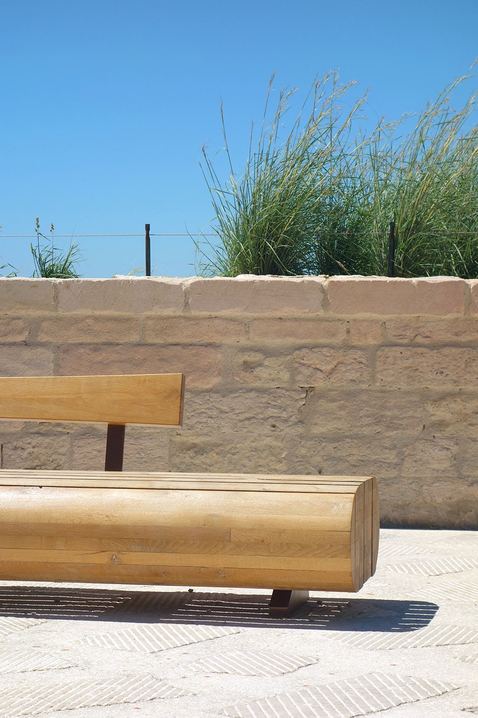 退臺(tái)式休息空間位于d’Armes廣場(chǎng)的東側(cè),坐落在Georges Henri Rivière大樓的對(duì)面,與Georges Henri Rivière大樓同長(zhǎng),并在與Mucem人行天橋交匯處向北轉(zhuǎn)折。木制座椅可以提高戶外生活的舒適度。這處休息空間自帶高差,通過一系列大小不一的石階和坡度為4%的之字形石質(zhì)坡道來(lái)實(shí)現(xiàn)彼此之間的聯(lián)系。坡道系統(tǒng)從d’Armes廣場(chǎng)的南側(cè)開始,一部分延伸到東北側(cè)的人行天橋處,另一部分則通向東側(cè)的山地花園。