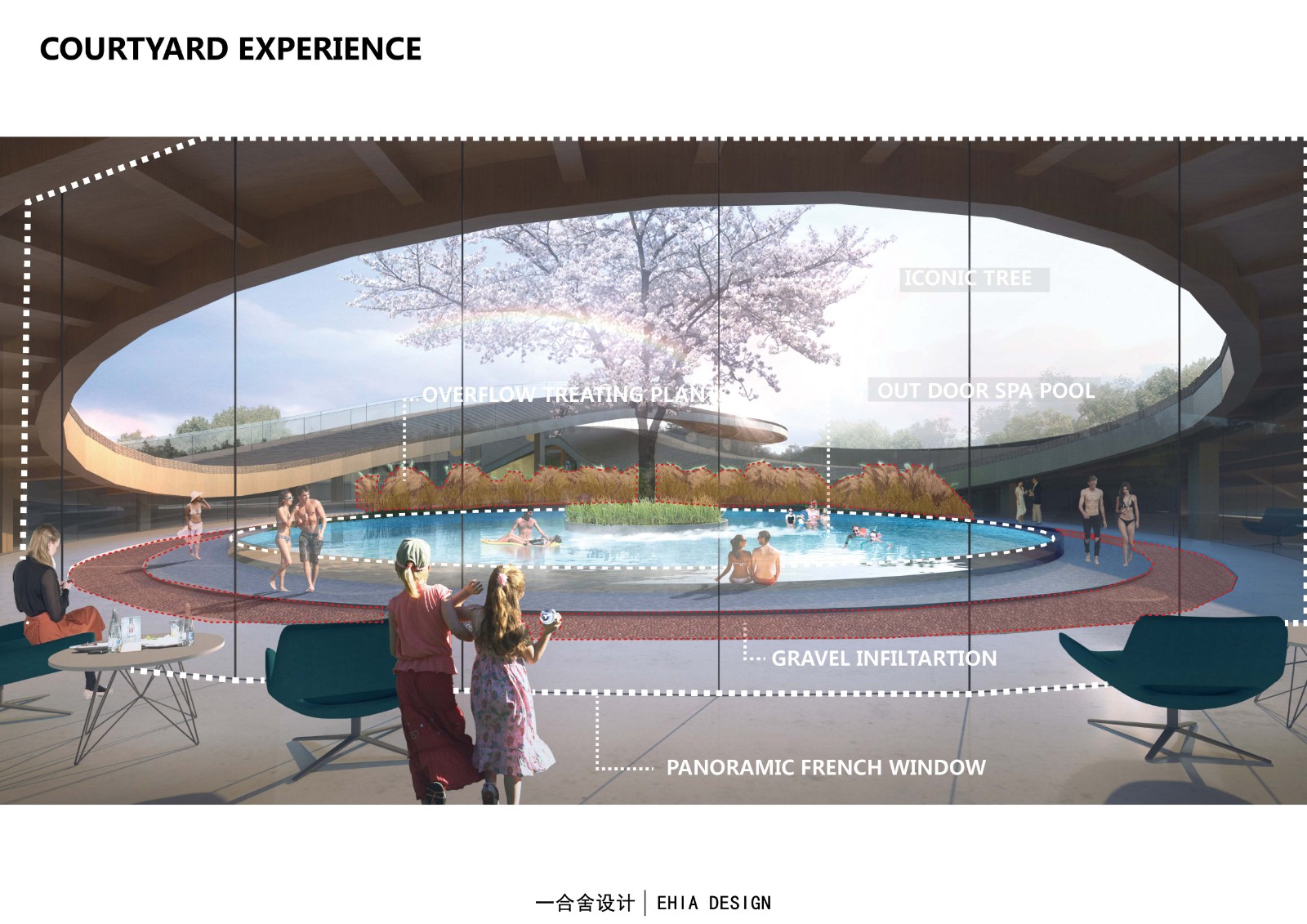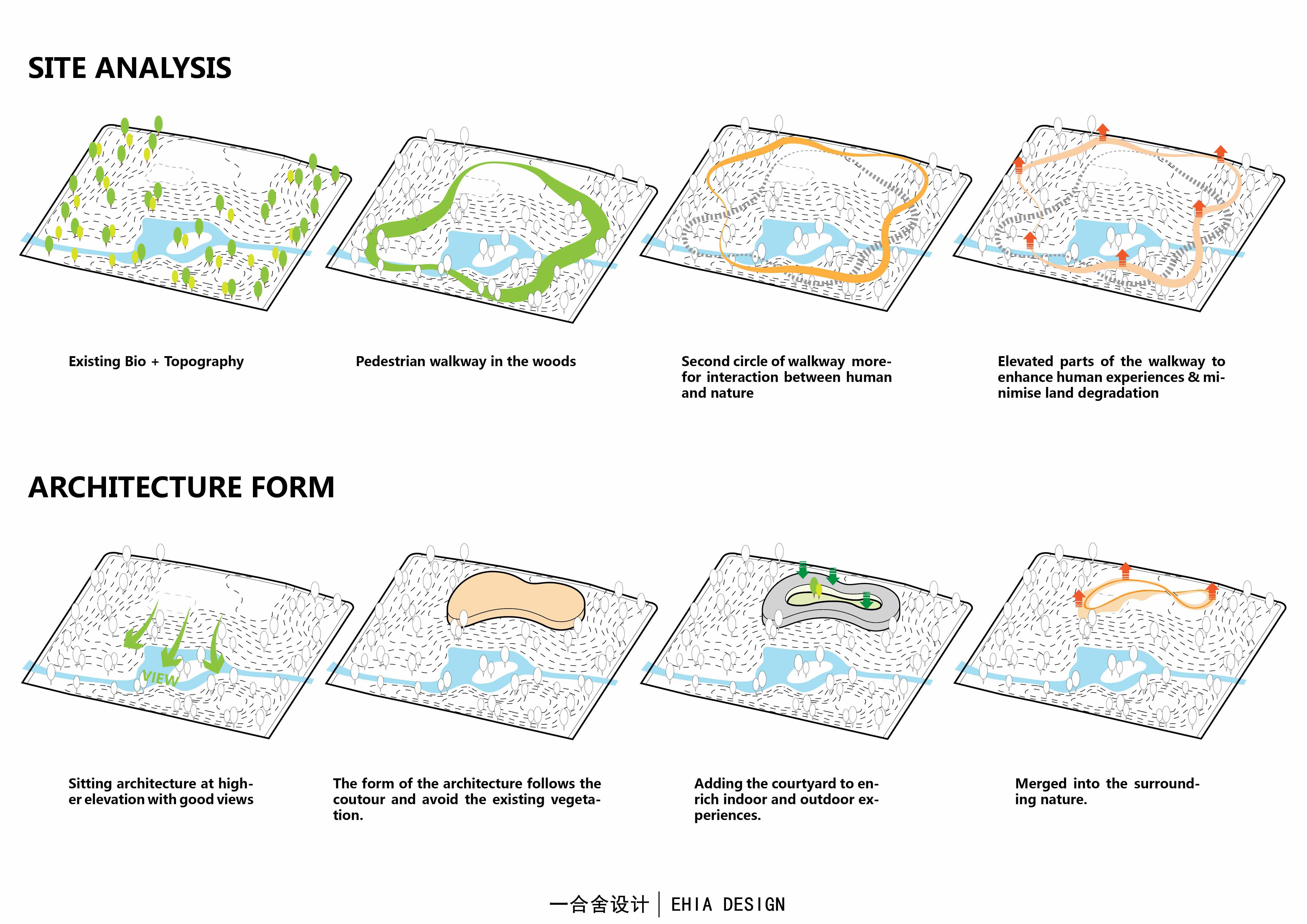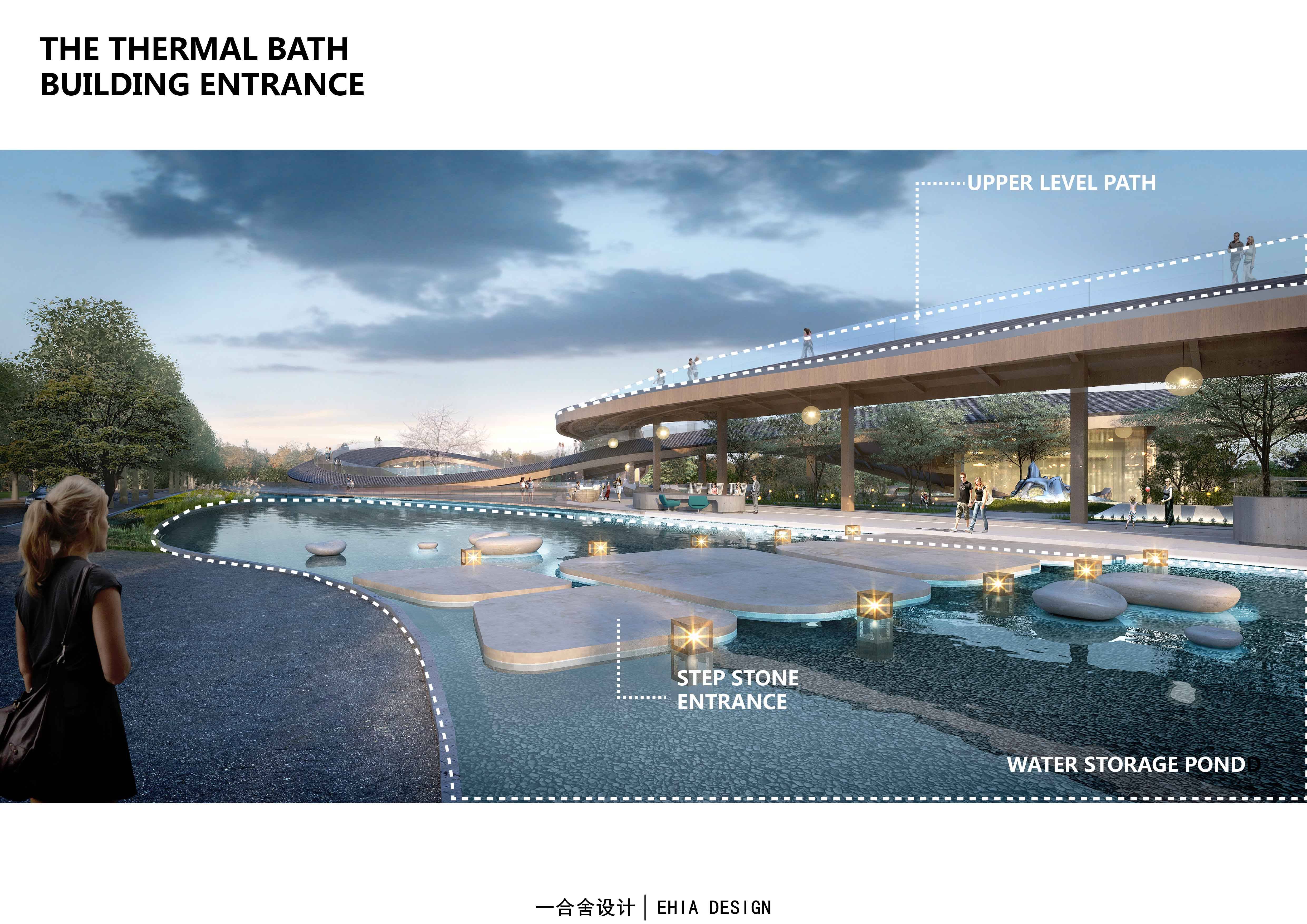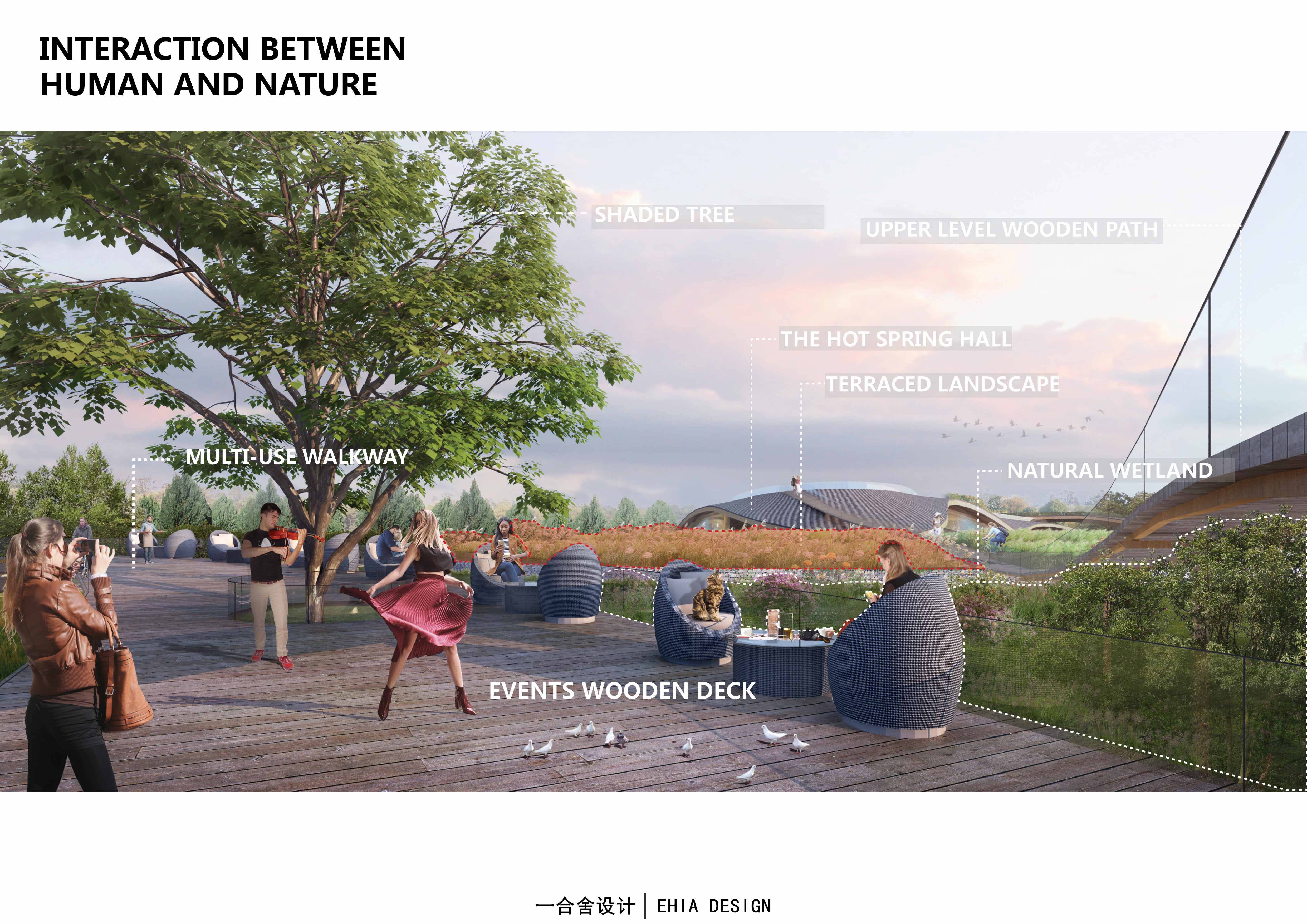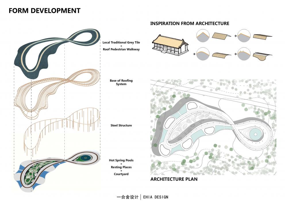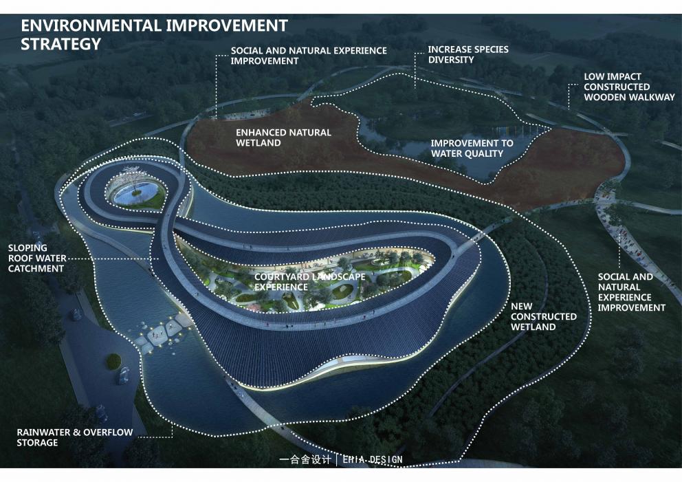設計中運用了中國傳統(tǒng)理念:“行云流水,生生不息”以及傳統(tǒng)元素和語言做為設計形式,在保證最低干預當?shù)丨h(huán)境的前提下,以保證生態(tài)可持續(xù)性為理念,增強人與自然的互動體驗。