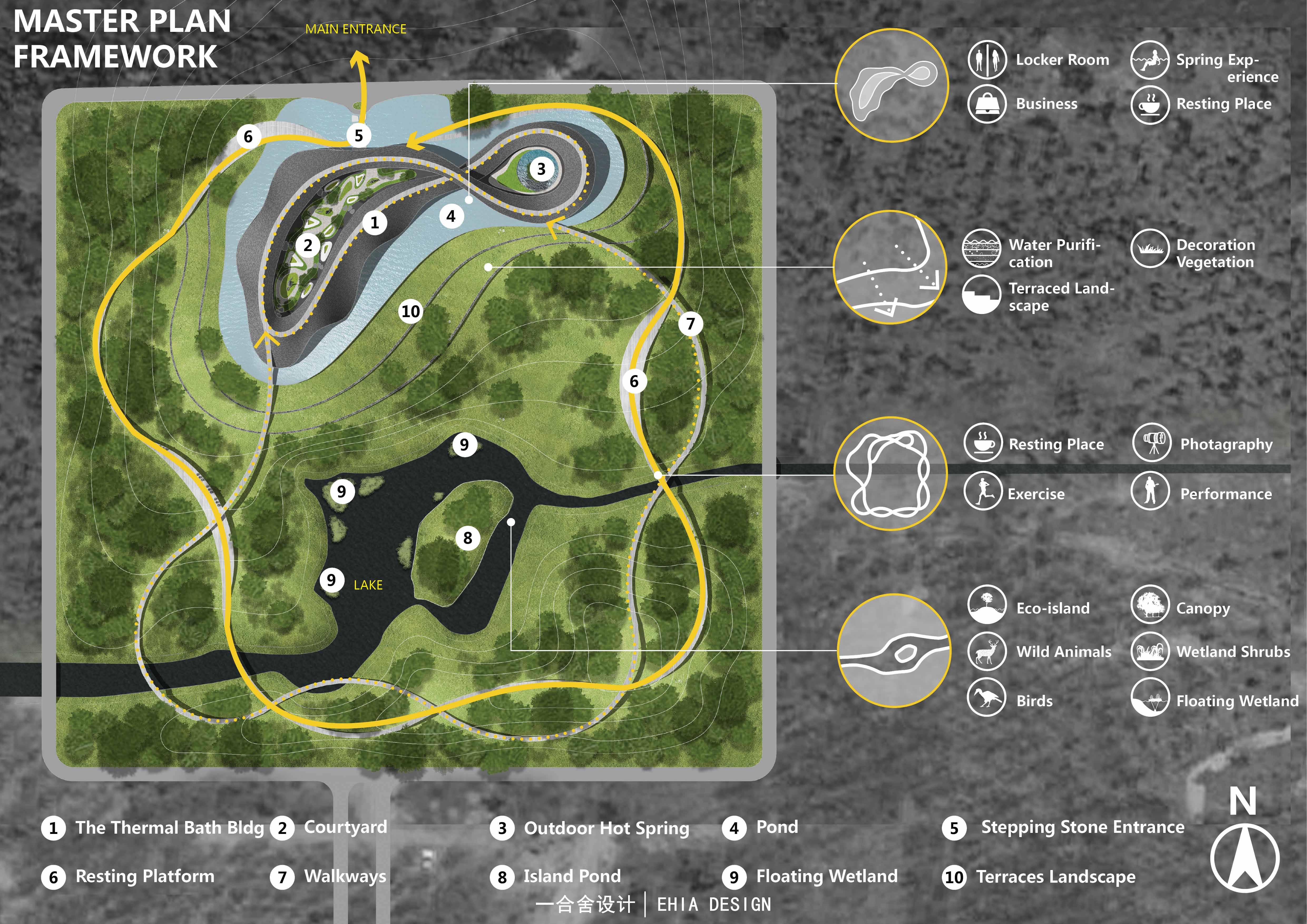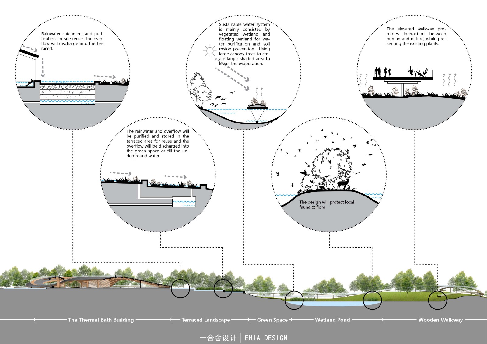 以現(xiàn)代的手法將傳統(tǒng)的元素加以應用,結合生態(tài)技術的使用,最大化的減小對于現(xiàn)狀生態(tài)系統(tǒng)的干預,滿足業(yè)主對于生態(tài)維護以及應用中國傳統(tǒng)文化元素的需求。而后生態(tài)系統(tǒng)的構成形成豐富的動植物生境氛圍,提升人們除冬季溫泉旅游外不同季節(jié)的體驗。