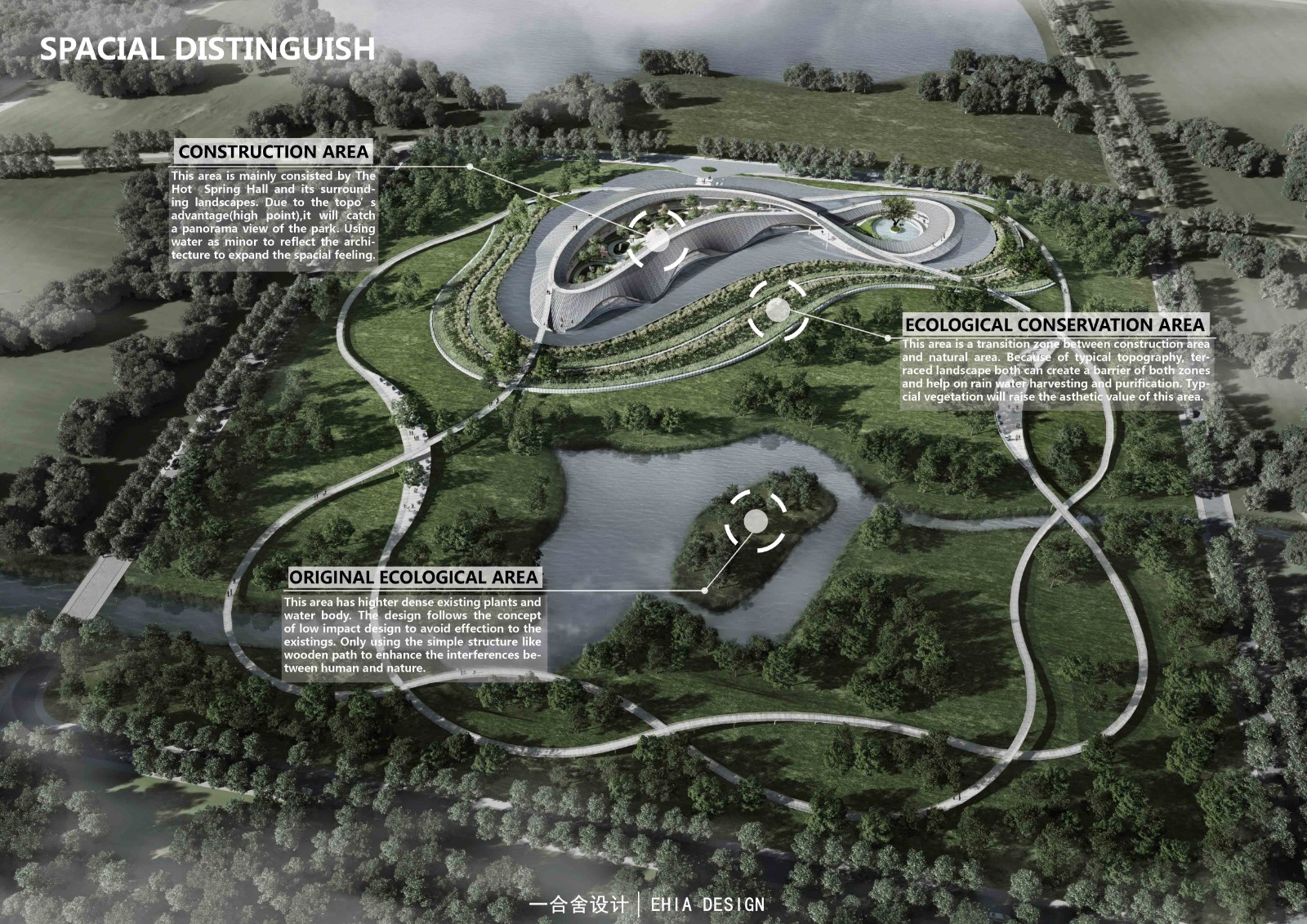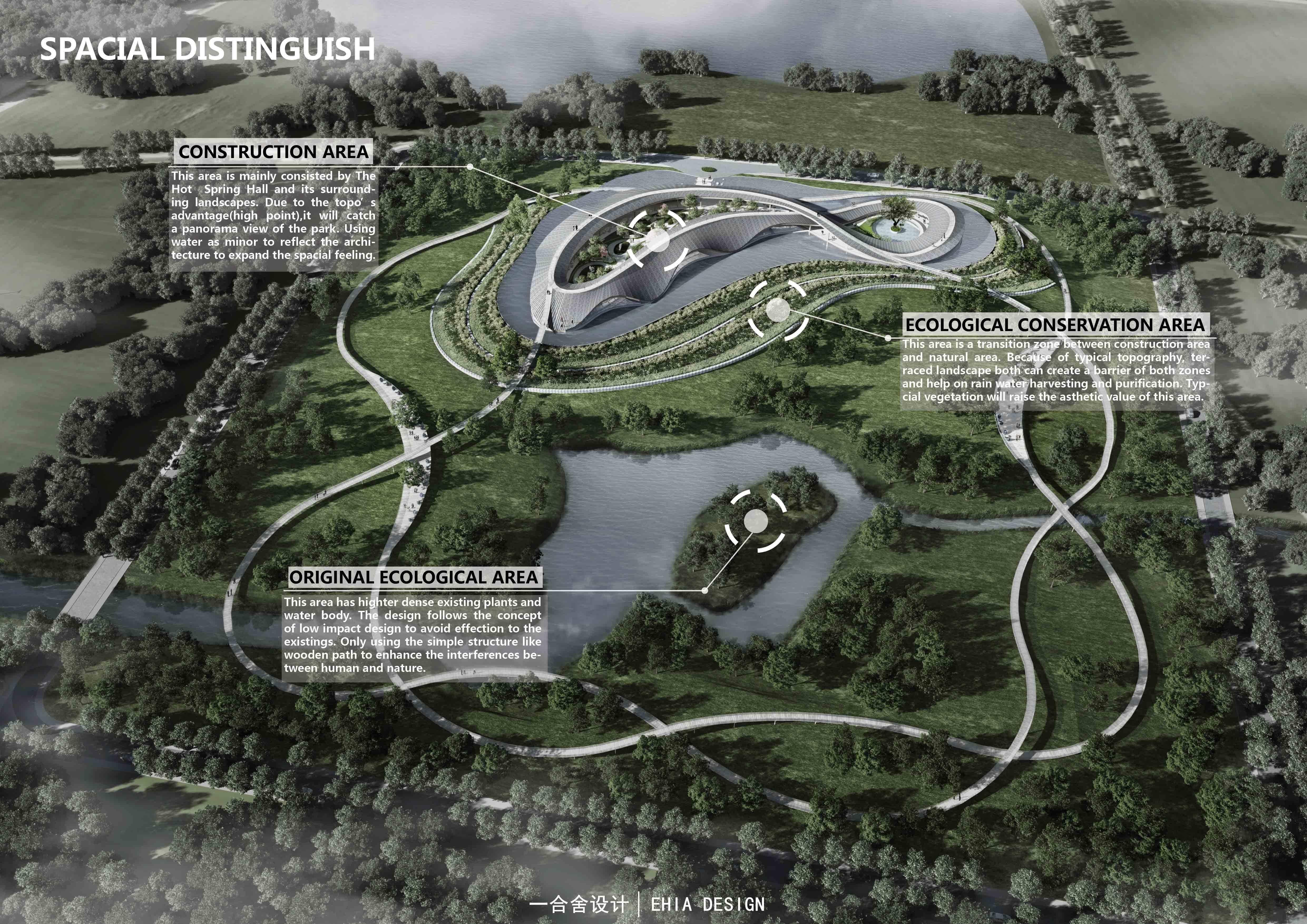 本著因地制宜,尊重現(xiàn)狀環(huán)境而選擇溫泉建筑的位置以及步道路徑的設置。根據(jù)地形,植被分布將場地分為“人工建設區(qū)”,“保護過渡區(qū)”,“低干預生態(tài)區(qū)”,通過對場地越來越少的人工干預,完成由“人工”到“自然”的過渡,最終以低調、樸實的姿態(tài)與大自然融合共生,延續(xù)生態(tài)。