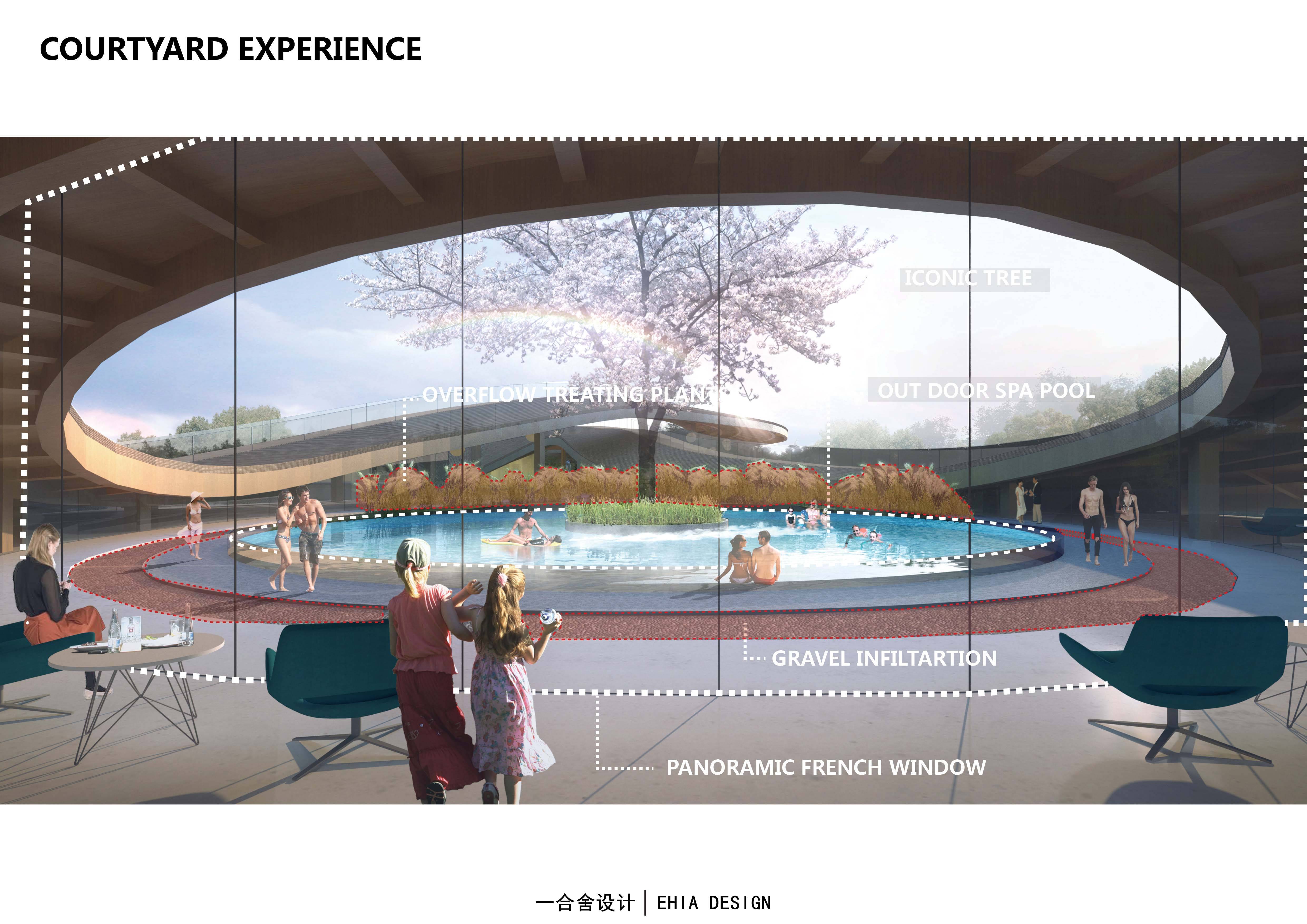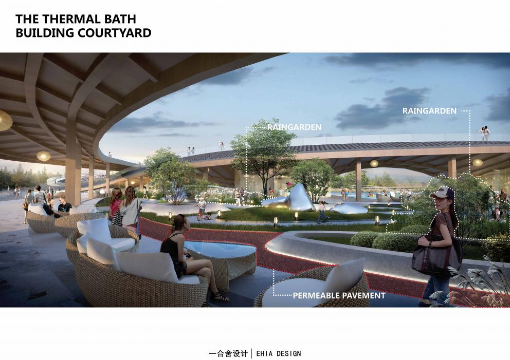 此區(qū)域主要為溫泉及其配套周邊設施,選擇的位置為場地地形相對最平整,開闊的地區(qū)。溫泉建筑采用半開敞式空間設置,屋頂運用中國傳統(tǒng)瓦片元素的語言,并在屋頂設置步道,使人們能夠得到更寬闊的觀景視野。中庭中也加入了如雨水花園,透水鋪裝等生態(tài)設施,讓整個中庭除了有極高的觀賞性之外,還保證了生態(tài)功能性。結合建筑及其周邊加入雨水收集處理的技術,完善生態(tài)體系。