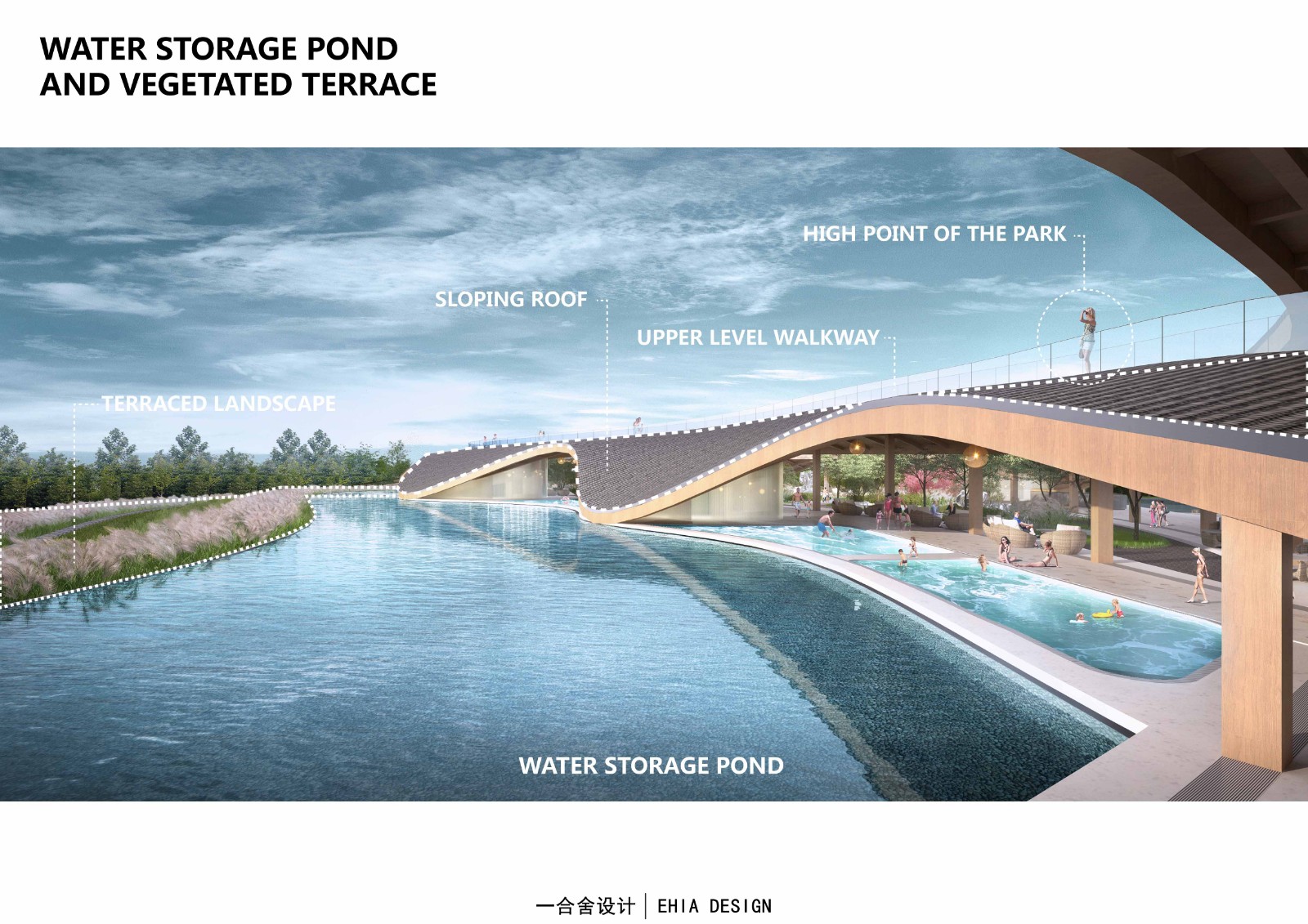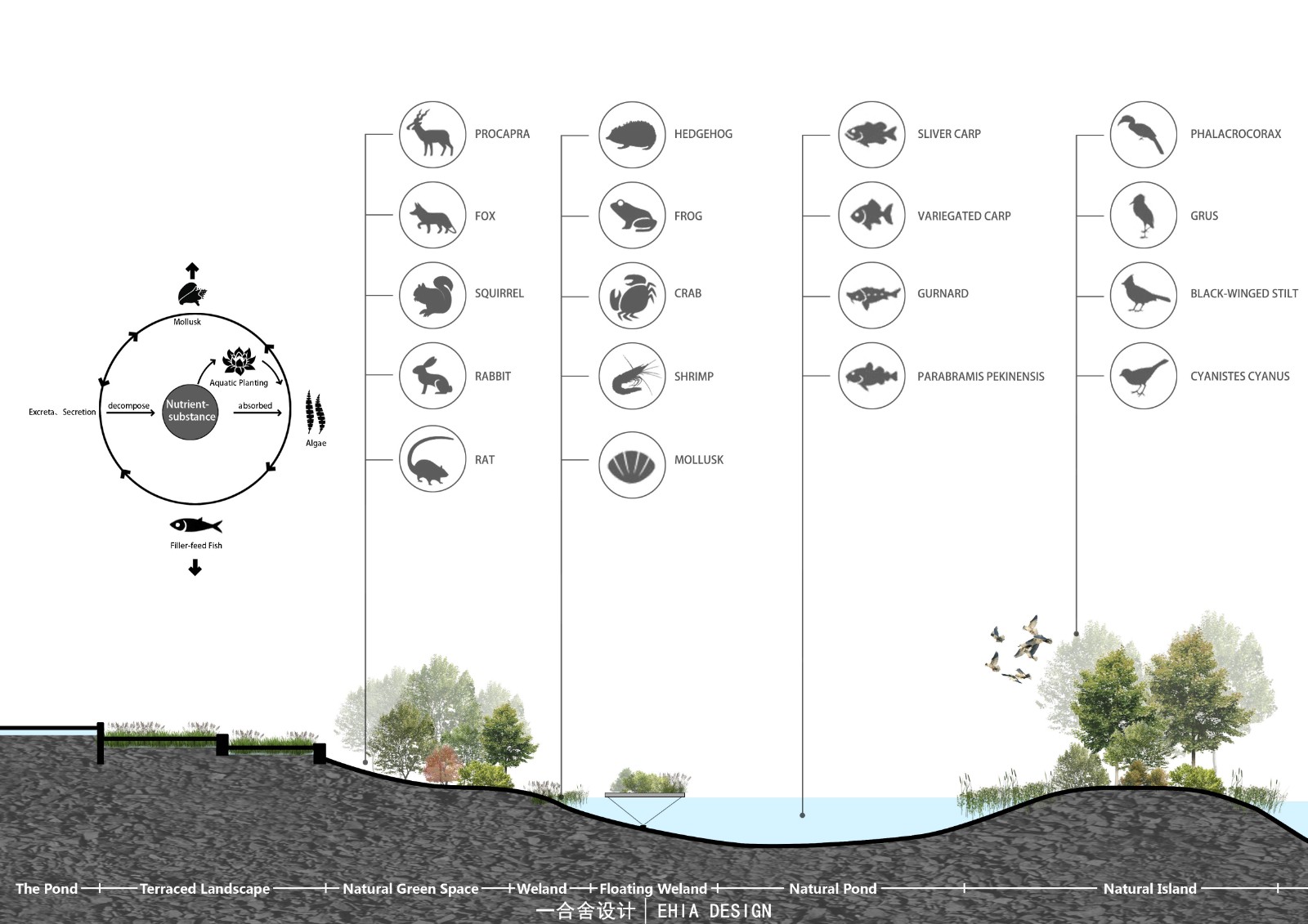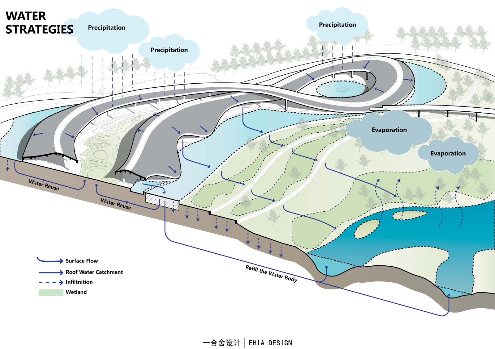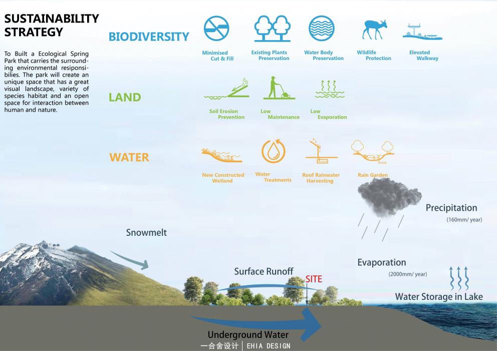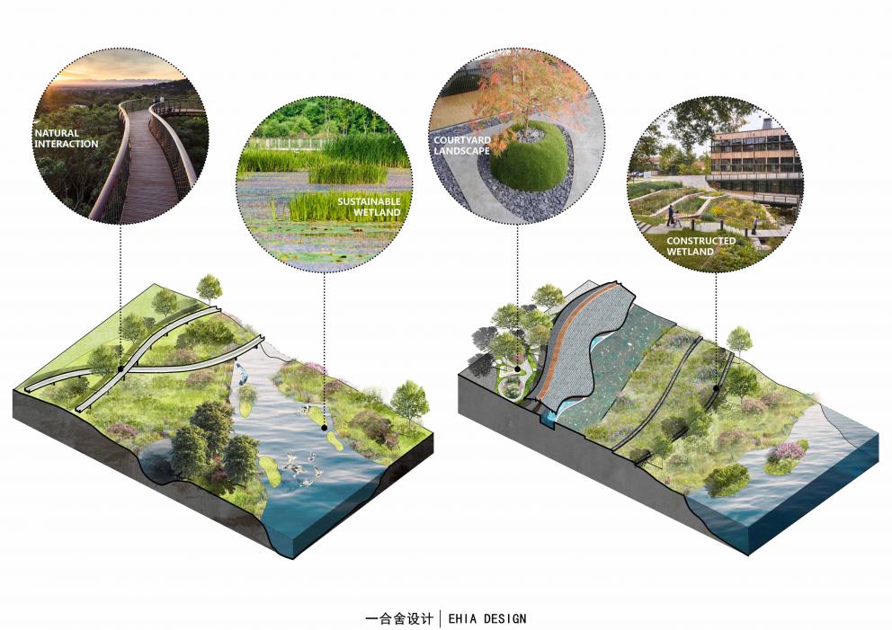 在水岸邊以及湖心生態(tài)島種植喬木,利用增加陰影面積減小水域蒸發(fā)量;還有在現(xiàn)狀湖里放置生態(tài)浮島,增加水面水下物種多樣性;以及通過抬升場地設施來減小對現(xiàn)狀環(huán)境的干預等一系列手法來實現(xiàn)并完善生態(tài)可持續(xù)的目標。