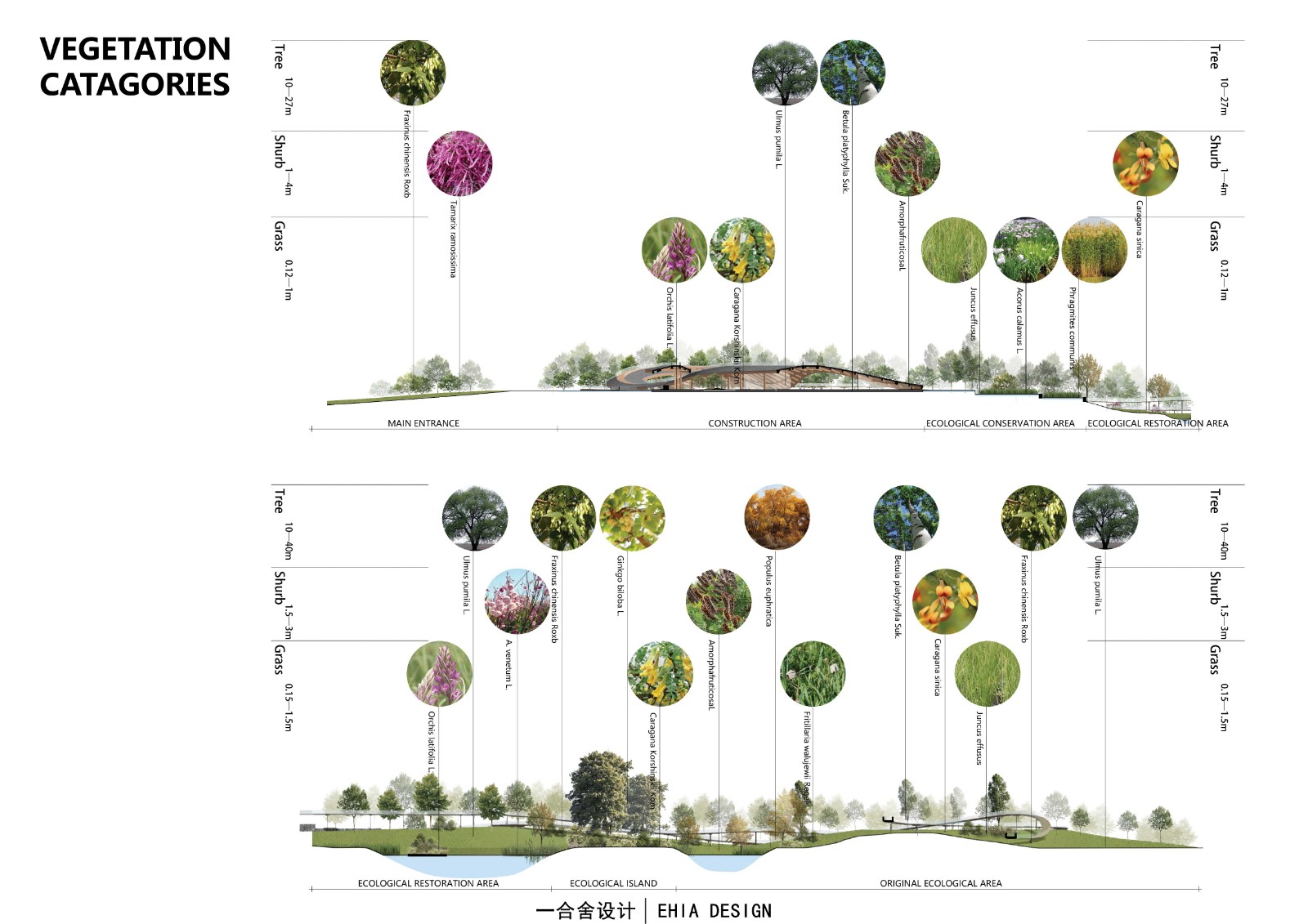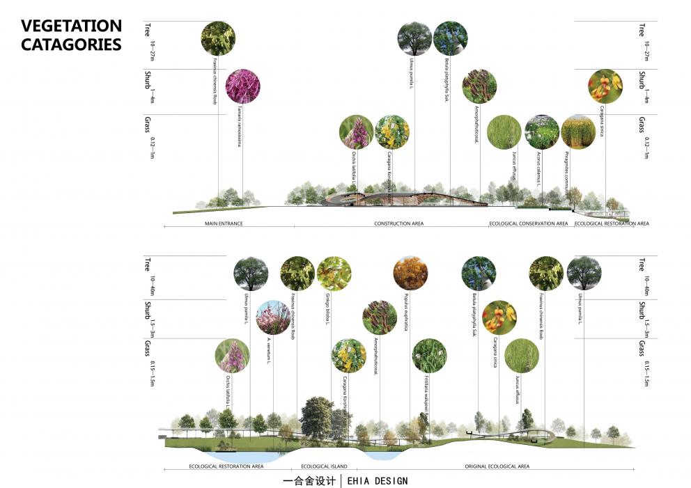 除了保護場地現(xiàn)狀植物外,設計中也加入適用于本地植物,如國槐、白蠟、丁香、忍冬、菖蒲等來增加功能性,觀賞性,以及生態(tài)性。生態(tài)的提升自然會增加動物物種的多樣性,從而更加完善地區(qū)的生態(tài)系統(tǒng)。