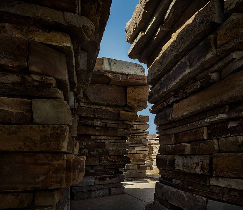 為了能賦予Gathering Place更多當(dāng)?shù)靥厣?,設(shè)計(jì)師在公園中以不同的方式大量使用了從俄克拉荷馬州東部和阿肯色州的采石場收集的富含礦脈的多種顏色的砂巖石,還有從阿肯色河對岸挖出的4500立方米的石頭。公園中的洞穴、迷霧谷和峽谷狀公園入口,透著一股上世紀(jì)70年代美國西部片的場景。這個設(shè)計(jì)是設(shè)計(jì)師考察郊區(qū)的Chandler公園時想到的,公園內(nèi)貌似從天而降、紋理和斷層分明的巖石墻給了設(shè)計(jì)師很大的震撼。
