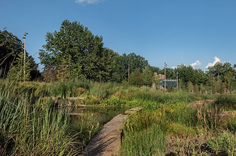 佩吉池塘蓄水量達(dá)到600萬加侖(約2300萬升)是公園的中央水庫,也是公園植物灌溉主要水源。為了建造這個池塘,MVVA硬是挖地70英尺(約22米)直至到達(dá)地下水位。公園北部的濕地是天然的植物過濾池可以清潔從池塘抽出的水。停車場內(nèi)設(shè)有快速滲透凈化設(shè)施,從停車場和公路流經(jīng)的水也先進(jìn)入濕地進(jìn)行初步過濾后通過兩個大水箱和地下自然過濾池過濾。