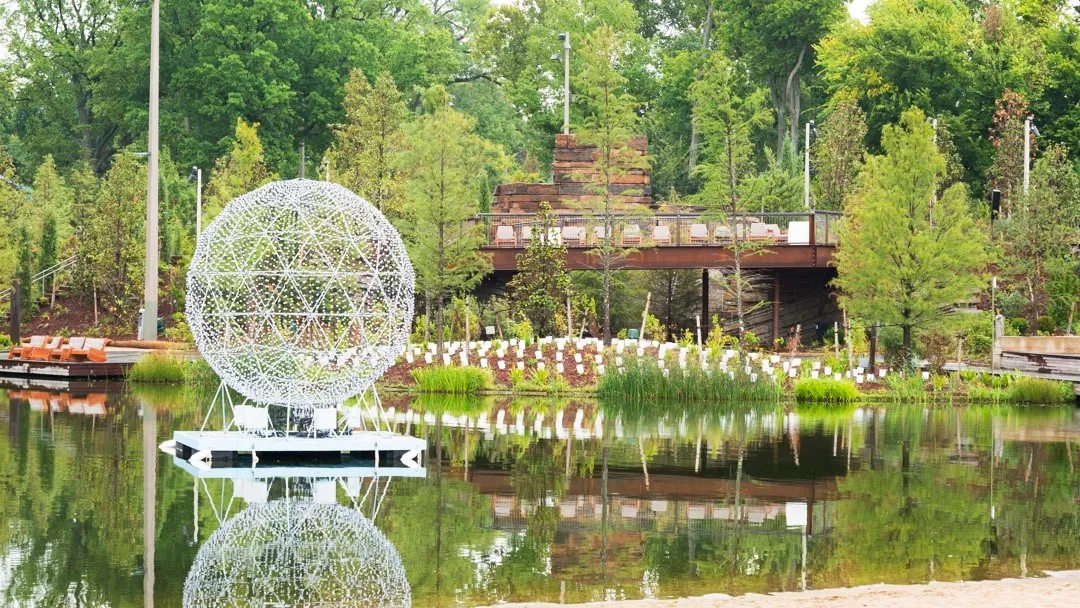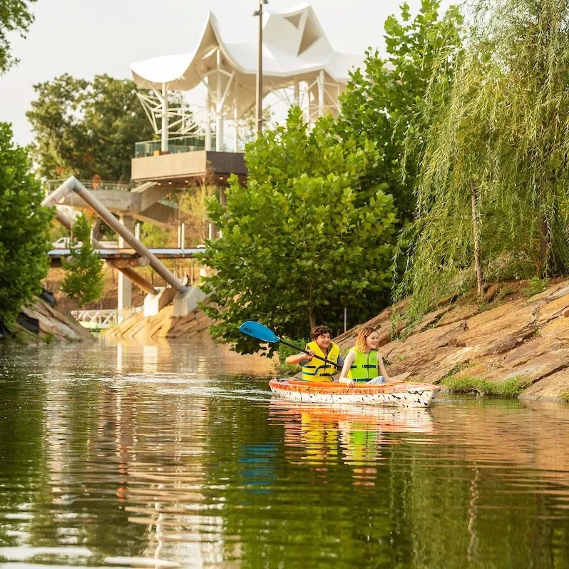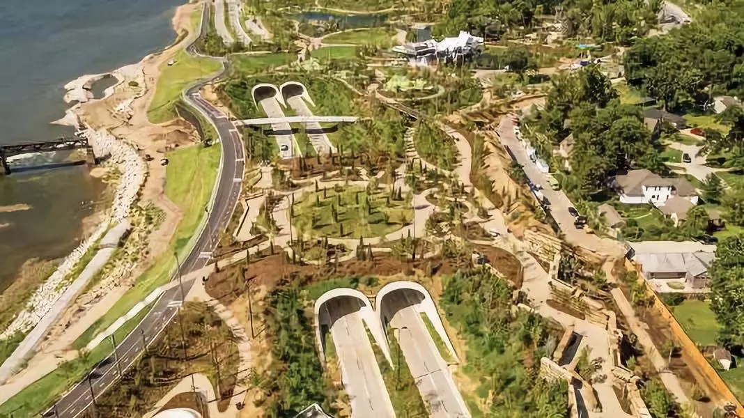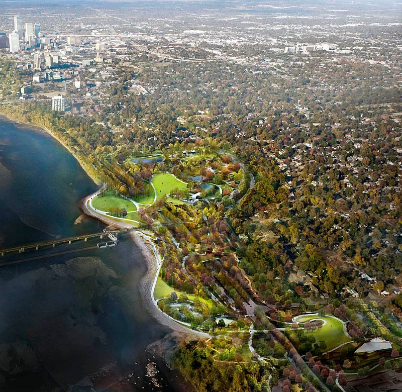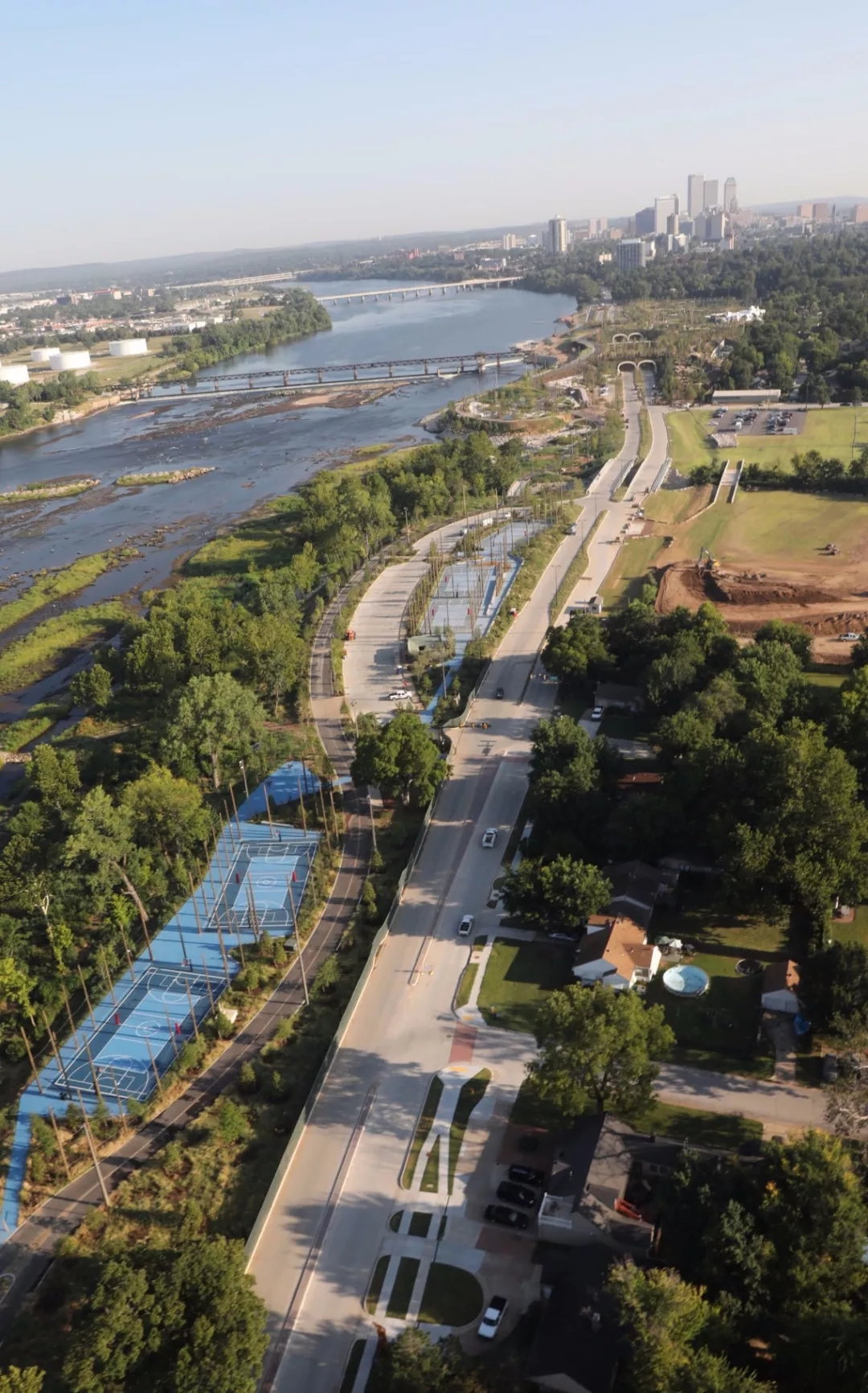從場地本身而言,位于阿肯色河畔是優(yōu)勢,但卻被擁擠的車道隔開。設(shè)計(jì)師被要求在車道上方建設(shè)高架公園的方式連接公園與阿肯色河的濱水空間,這一操作雖然在施工技術(shù)上有難度,但是能將公園范圍延伸到阿肯色河,極大的增加了公園魅力和優(yōu)勢。