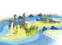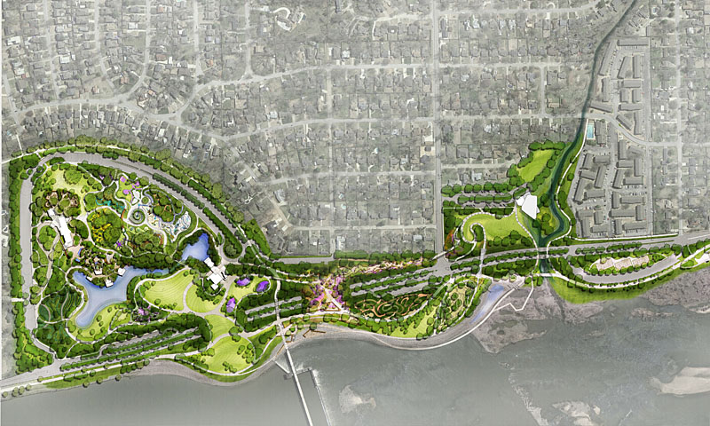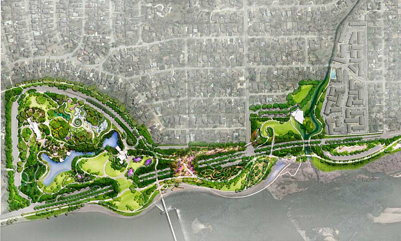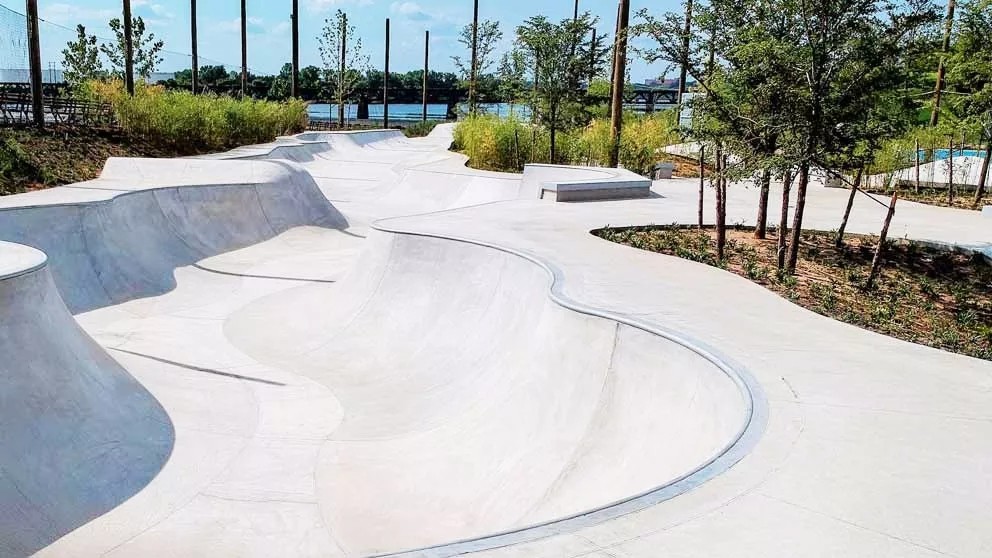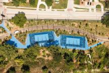圖爾薩市位于美國中部內(nèi)陸偏西的平原地區(qū),周邊沒有高山,受風(fēng)的影響大,夏季炎熱降水量低,加上阿肯色河在旁等,激發(fā)了水成為公園重要組成元素的想法,豐富游玩方式和公園景觀結(jié)構(gòu)。設(shè)計(jì)師也在易受到暴曬和處于風(fēng)口的地方做了些微地形改造,對部分地區(qū)選擇增設(shè)水空間并大量種植本土植物來應(yīng)對場地地形過于平坦帶來的問題。另外,這些改造后的地形可將場地劃分成一系列小空間,對增加各種類型的活動空間提供了可行性。