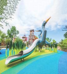兒童空間及游樂設(shè)施不僅種類多樣,設(shè)計(jì)也是大膽且充滿夢幻色彩。巨大的動物、水果等超乎想象的元素與塔樓、滑梯、橋、秋天等設(shè)施交織在一起,創(chuàng)造了一系列充滿想象力和挑戰(zhàn)性的游戲空間。