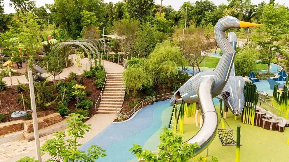 Gathering Place公園第一階段占地64英畝(約26萬平方米),位于俄克拉何馬州阿肯色河沿岸,距圖爾薩市區(qū)僅兩英里。它是美國最大的私人出資建造的公園,喬治·凱撒家族基金會提供了前其大部分建造資金。公園旨在服務(wù)周邊社區(qū)及市區(qū)居民,以消弭當(dāng)?shù)胤N族差異、貧富差距帶來的隔閡為目的,自2018年9月對外開放以來,尤其是在孩子群體中擁有了極高的人氣,得到了市民的認(rèn)可。