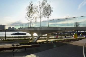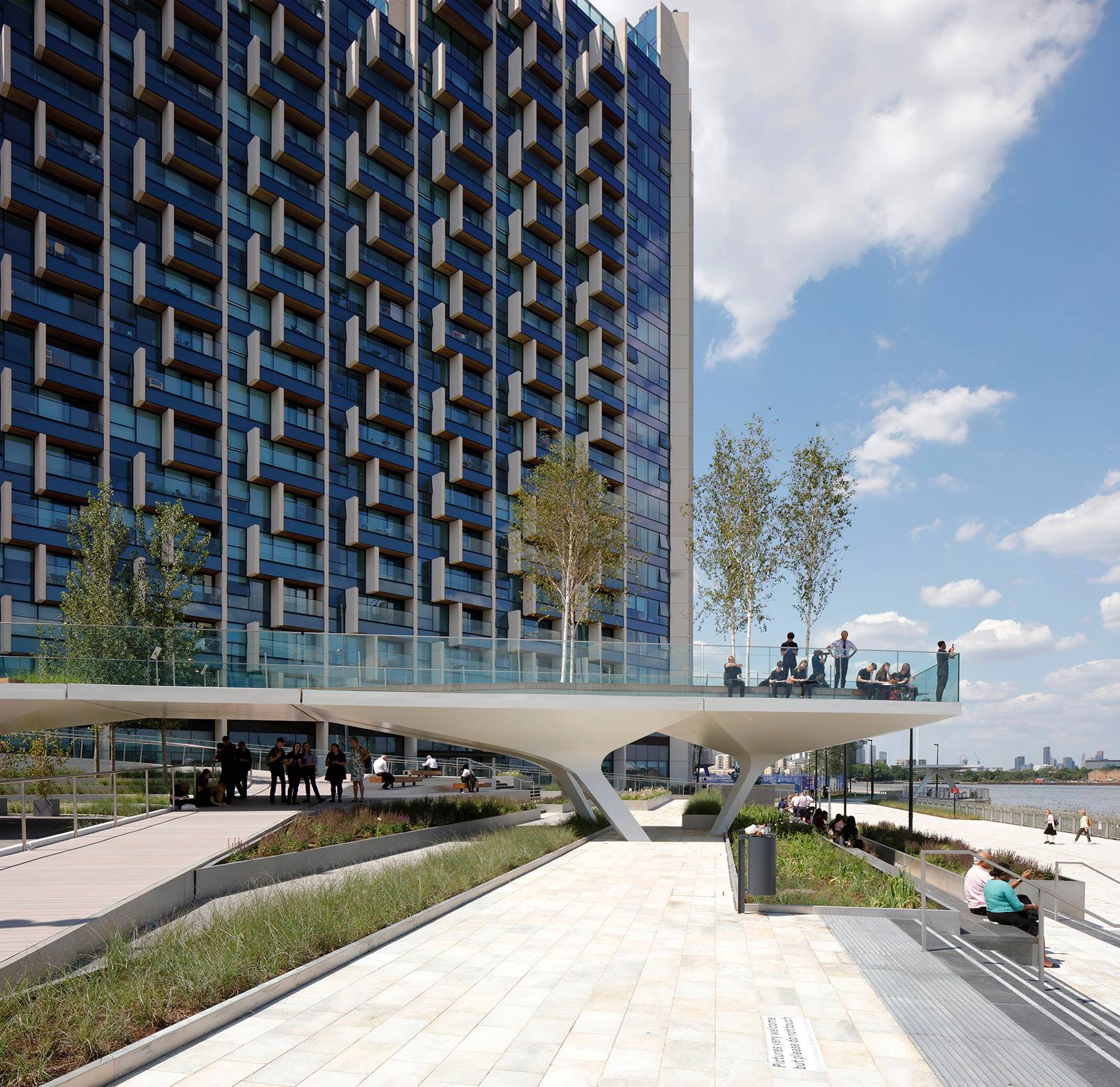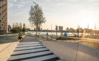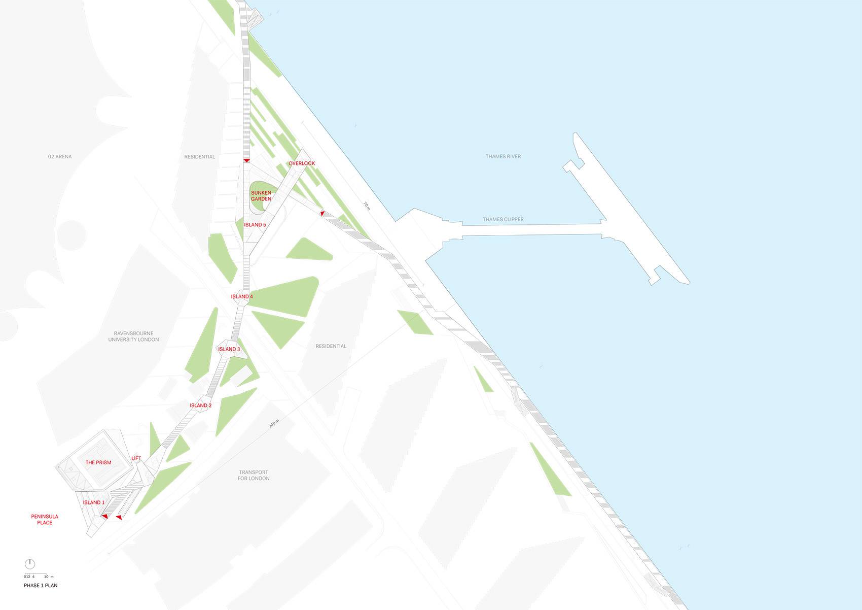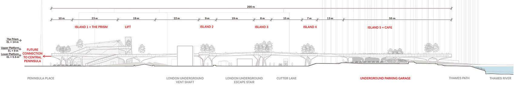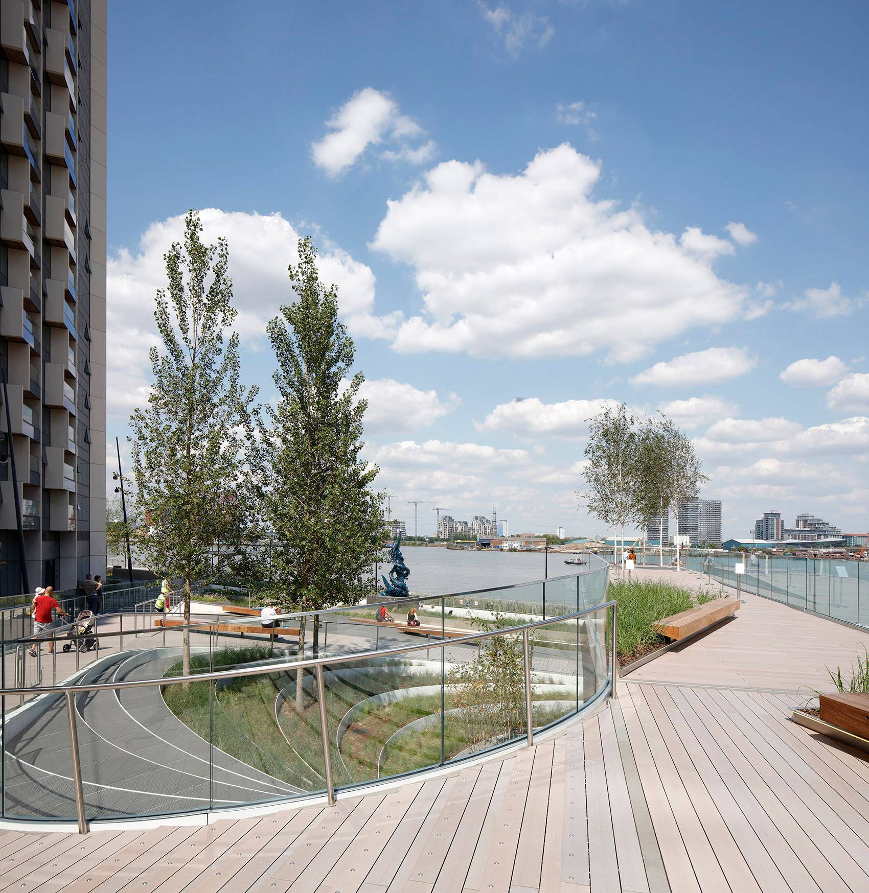 5公里長(zhǎng)的整體規(guī)劃中,前1公里是抬升于地面9米的空中步道——穿越原生樹(shù)林并途徑由Damien Hirst和Allen Jones創(chuàng)作的巨大雕塑。下沉花園、27米長(zhǎng)的戶(hù)外野餐桌以及被河流圍繞的獨(dú)特碼頭花園共同創(chuàng)造了遠(yuǎn)離城市喧囂的休憩場(chǎng)地。