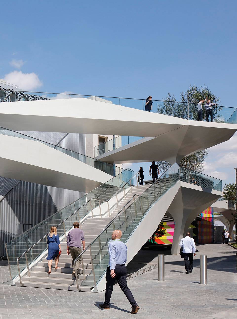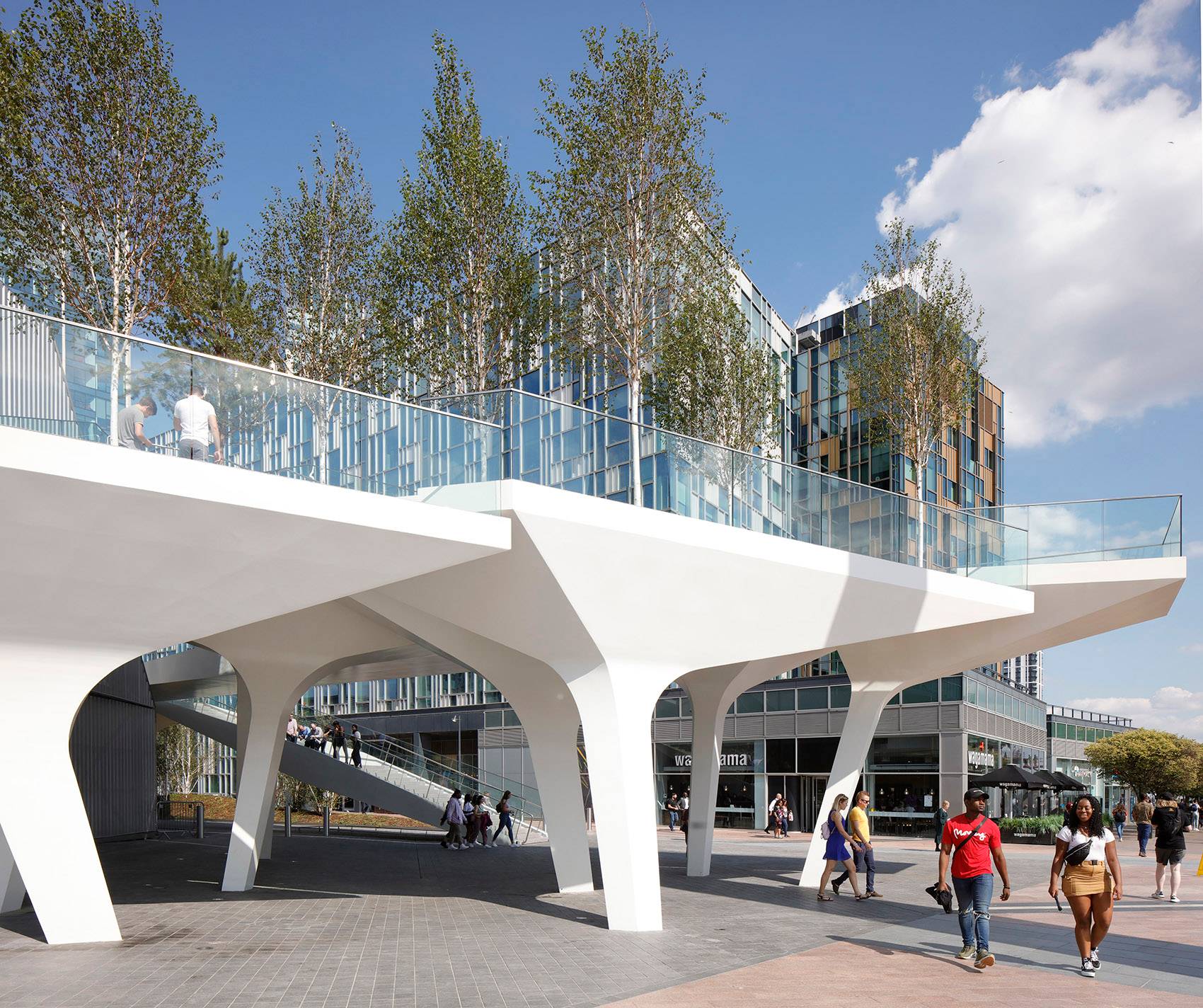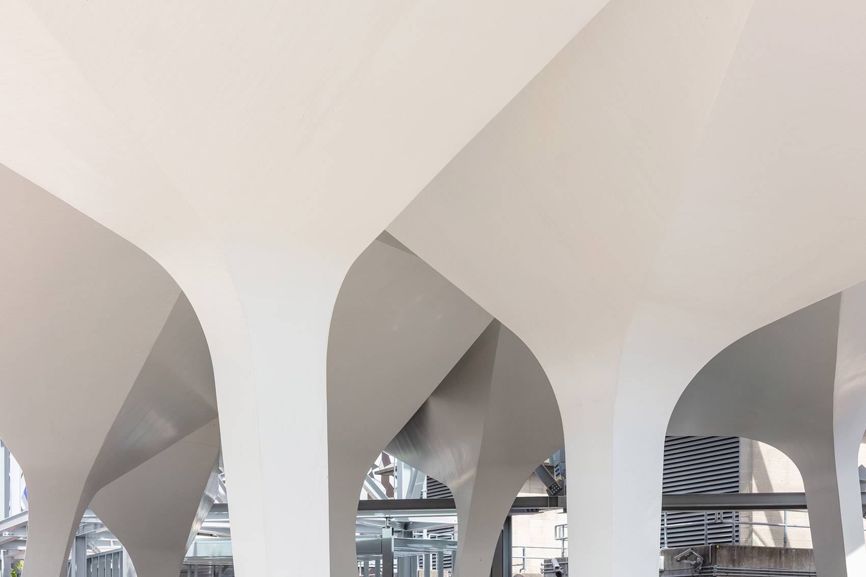 每個(gè)支撐結(jié)構(gòu)和橋梁均是由焊接的鋼板內(nèi)肋和外部的表皮構(gòu)成,呈現(xiàn)出機(jī)翼般的輕盈感覺(jué),同時(shí)最大程度地降低了結(jié)構(gòu)對(duì)下方倫敦地鐵站的影響。這些定制結(jié)構(gòu)由Cimolai在意大利裝配,隨后途徑泰晤士河直接運(yùn)送至場(chǎng)地,在幾天內(nèi)以螺栓完成固定。結(jié)構(gòu)元素的設(shè)計(jì)是在與AKTII的合作下借助參數(shù)化軟件完成的,能夠最大程度地提升材料的效率并降低制造的復(fù)雜程度,以最終實(shí)現(xiàn)沒(méi)有多余覆層的一體化結(jié)構(gòu)表達(dá)。