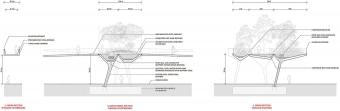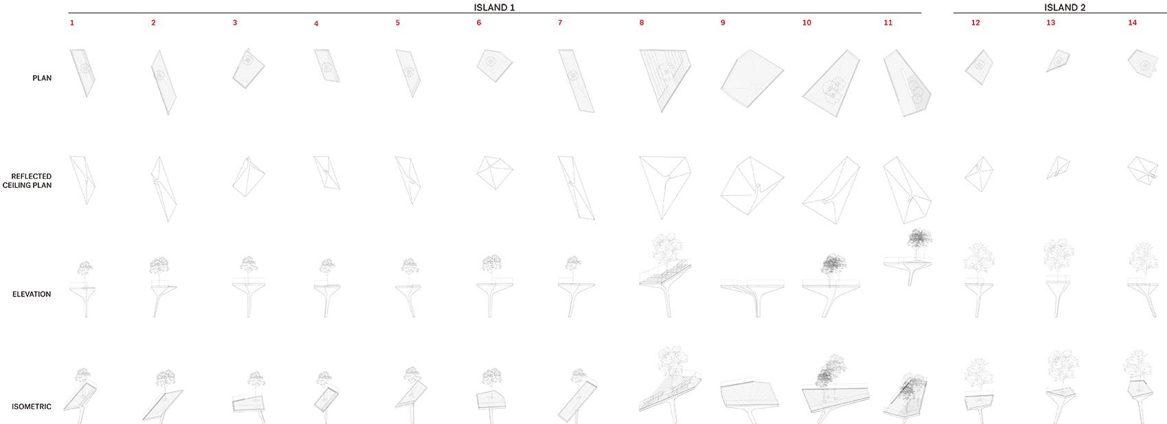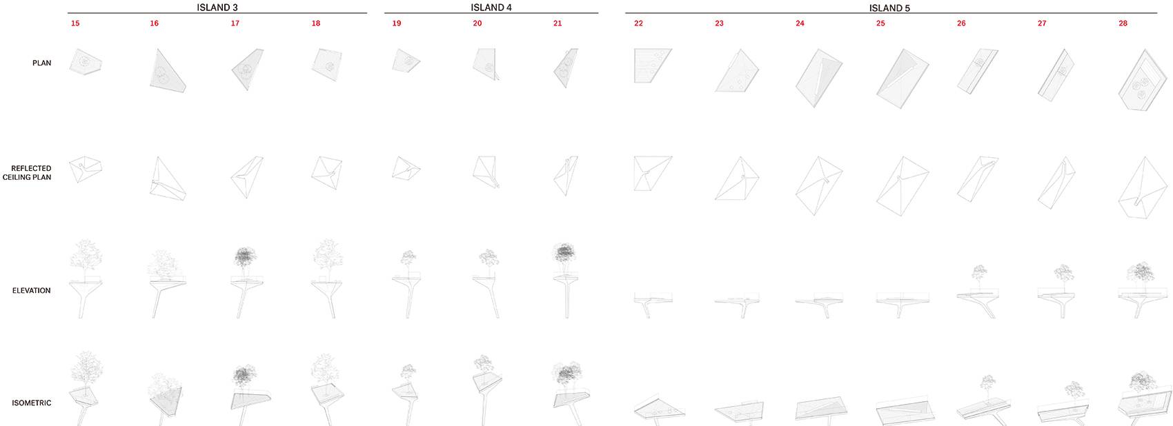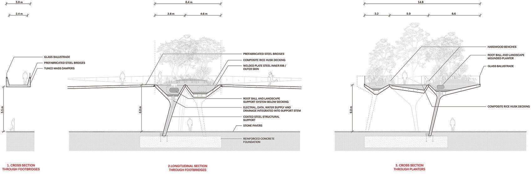 公園的第一階段包括28個(gè)獨(dú)特的支柱,它們相互組合為一系列三腳架般的結(jié)構(gòu),為上方的花園和步道提供了支撐,同時(shí)為廣場(chǎng)層帶來(lái)蔭蔽空間和反射照明。公園的照明、配電、數(shù)據(jù)和景觀(植被、土壤和給排水)系統(tǒng)均無(wú)縫地集成到每個(gè)支撐結(jié)構(gòu)當(dāng)中。預(yù)制的鋼制橋梁將島嶼連接在一起,形成了寬度為2.4米、跨度達(dá)26米的連續(xù)路徑。