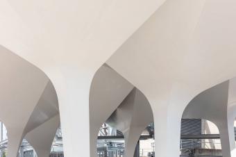 ▼在首層,支撐結(jié)構(gòu)構(gòu)成了拱形的入口和咖啡館涼亭