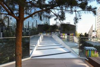 公園中選用的材料元素包括漆面鋼結(jié)構(gòu)、玻璃護(hù)欄、稻殼合成地板、硬木長(zhǎng)椅、粘合金屬飾邊、裸露混凝土、石砌路面和植被等。