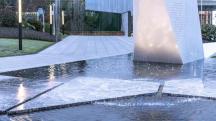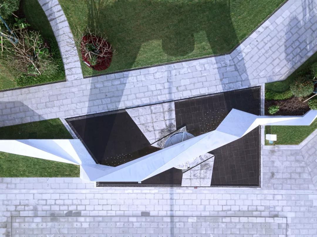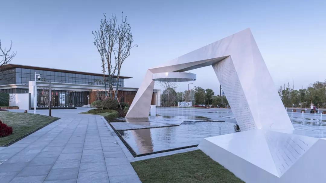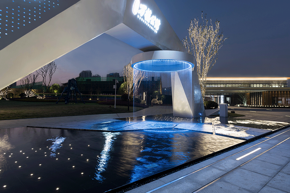 圓形數(shù)控水幕停止時,呈現(xiàn)的是天空與門的融合倒影,鏡面反應著云朵風云變幻的色彩,表達時空之門與萬樓的濃濃歷史感的相互呼應。