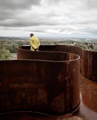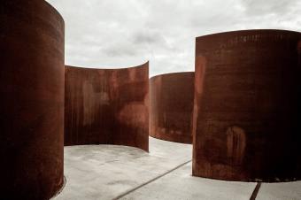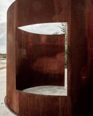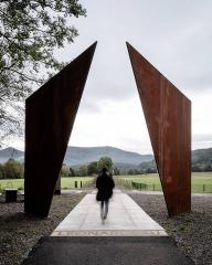 ▼道路盡頭聳立著兩塊巨大而輕薄的銹蝕鋼板,向著遠(yuǎn)處開(kāi)闊的原野微微傾斜