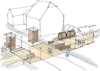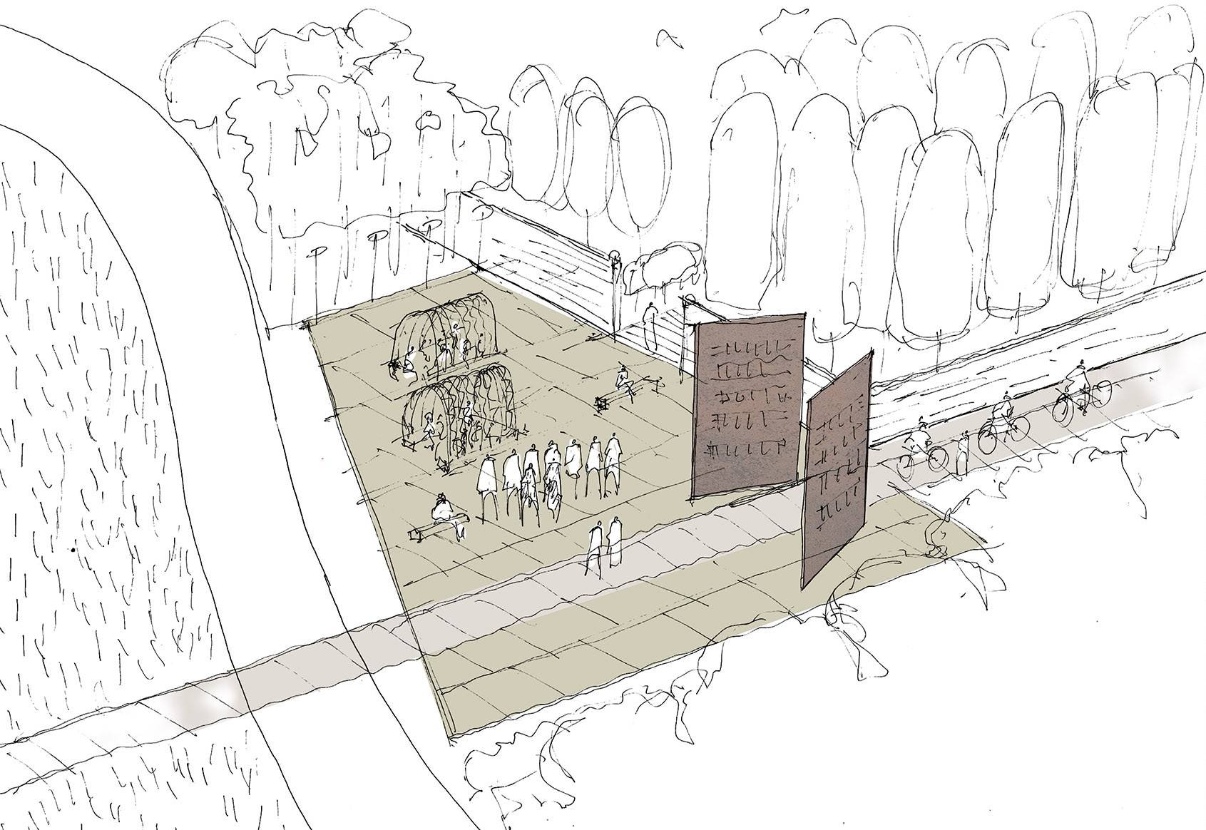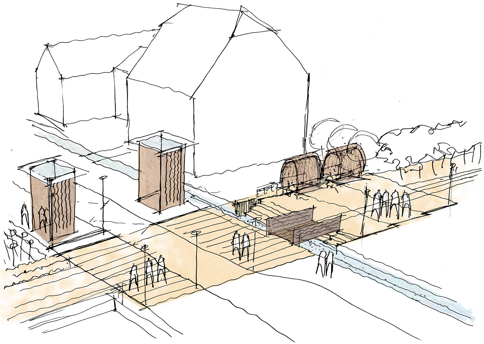 Boersch講訴著水的故事。奔騰的河流誠(chéng)實(shí)地反映著所在區(qū)域的環(huán)境狀態(tài),也是寧?kù)o風(fēng)景中一個(gè)極富活力的元素,一直流向大海,聯(lián)系起城鎮(zhèn)與世界。兩個(gè)高聳的木質(zhì)結(jié)構(gòu)如同城市入口處的一扇大門,也為游人提供了一片遮擋風(fēng)雨與日曬的場(chǎng)所。在濱河一側(cè),景觀團(tuán)隊(duì)拓寬了河岸,建立起一個(gè)大型開(kāi)放式露天劇場(chǎng),創(chuàng)造出人與水岸更為親密的關(guān)系。