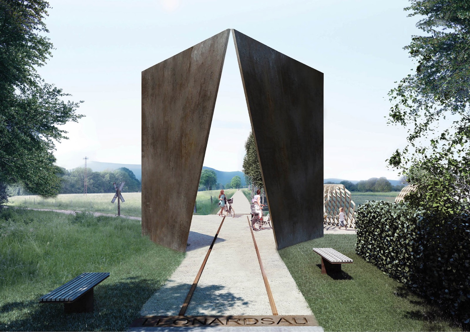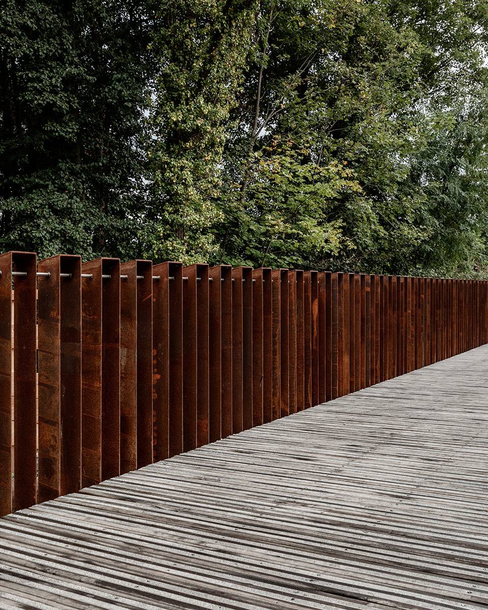 Leonardsau講訴著大地的故事。樹(shù)木聳立在道路的兩側(cè),用繁茂的枝葉搭建起一條綠色的“隧道”。道路盡頭聳立著兩塊巨大而輕薄的銹蝕鋼板,向著遠(yuǎn)處開(kāi)闊的原野微微傾斜,成為了兩種截然不同的景觀空間中的轉(zhuǎn)換。穿過(guò)這扇“大門”,遠(yuǎn)處St-Odile山脈起伏的天際線也隨之映入眼簾,仿佛召喚著人們繼續(xù)前行探索。