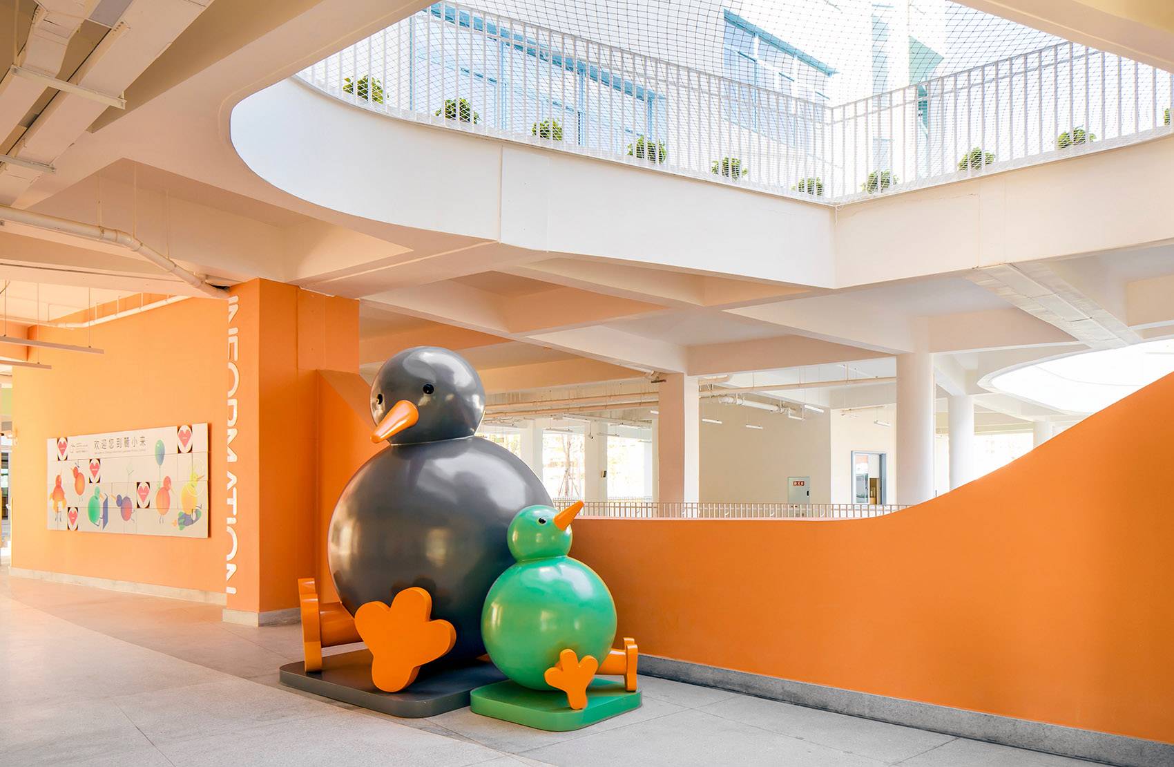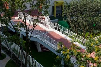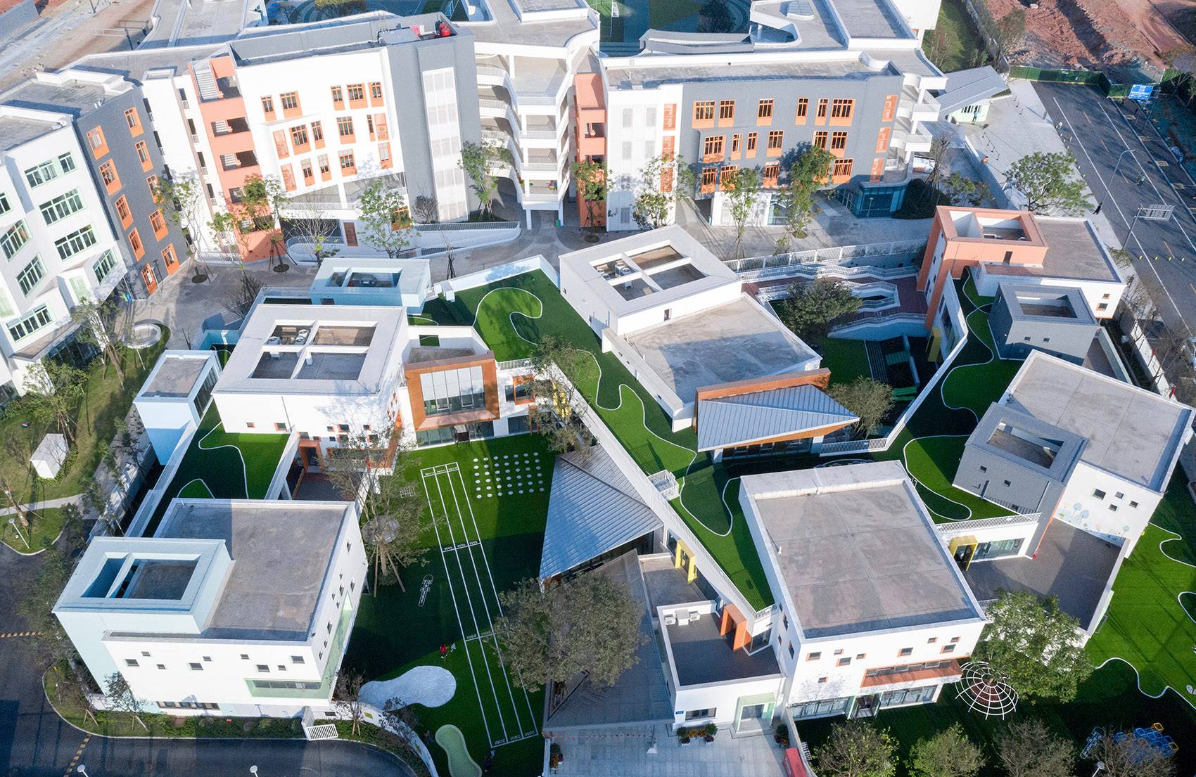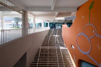 氣泡狀的綠地,河流般穿梭于室內外的通道,架空層與戶外的緊密連接,形成了靈動的、豐富的漫游式交通系統(tǒng),行走變得格外有趣,也在不同的停留中可以偶遇不同的空間面貌。空間的廣泛流動削弱了室內外的界限,也增加了空間的容量,也更大程度能讓孩子與生俱來的好奇心與探索欲得到釋放。