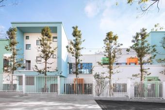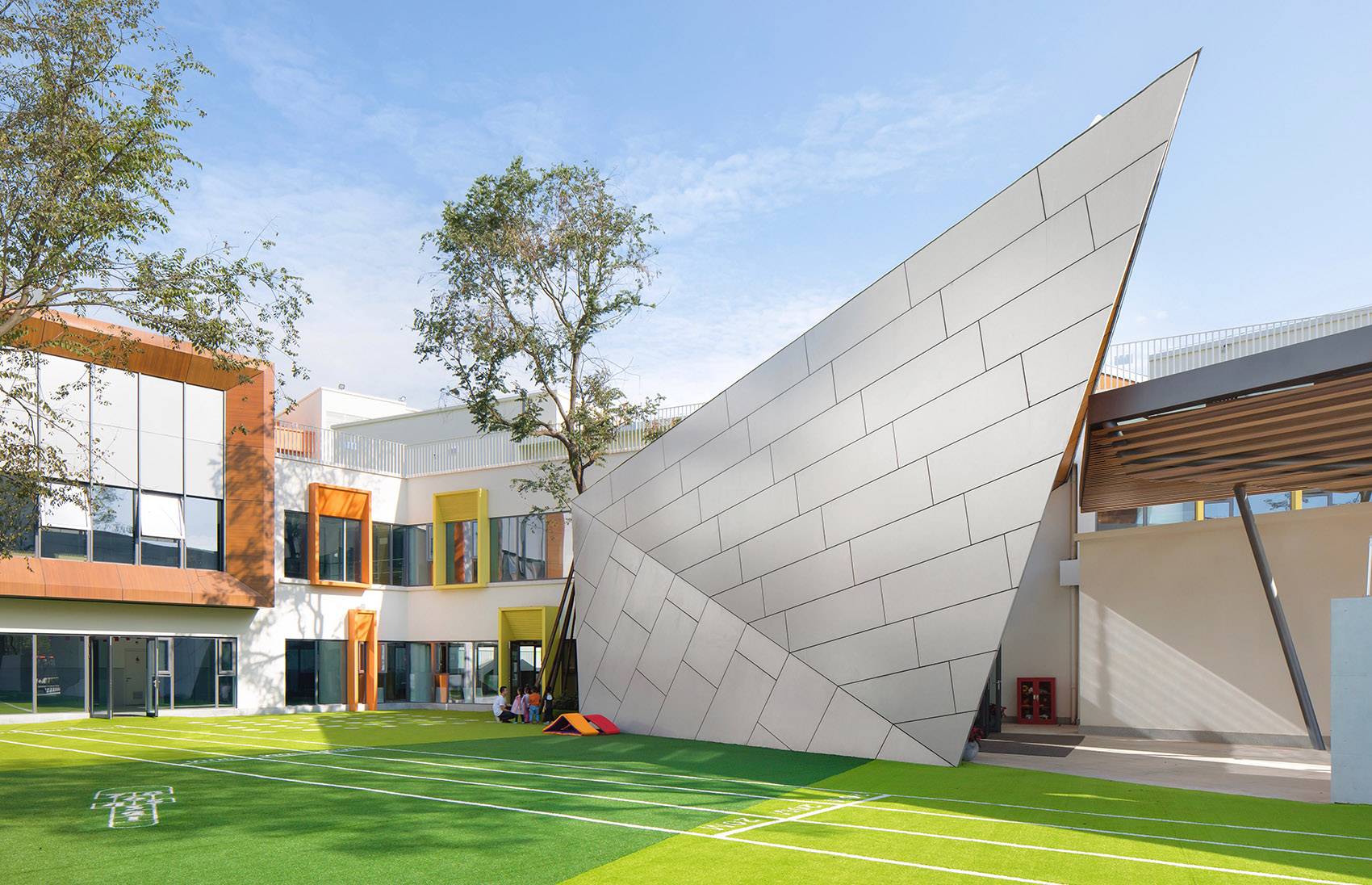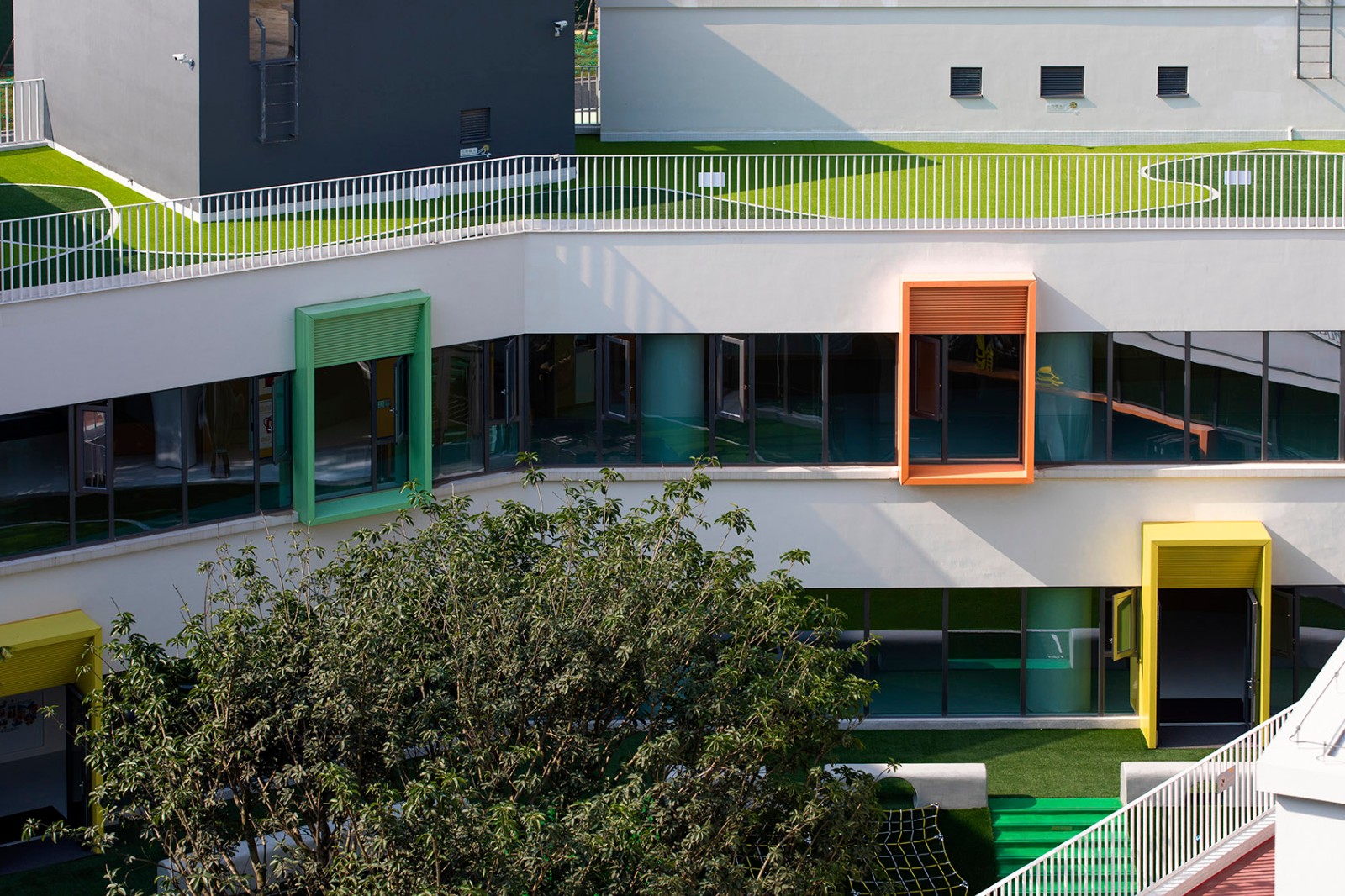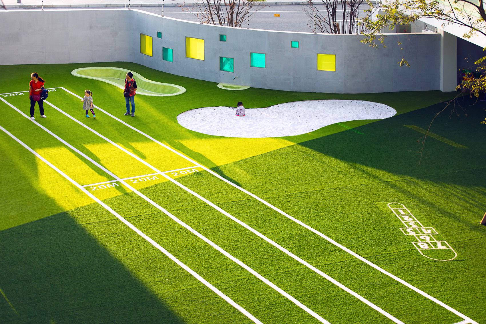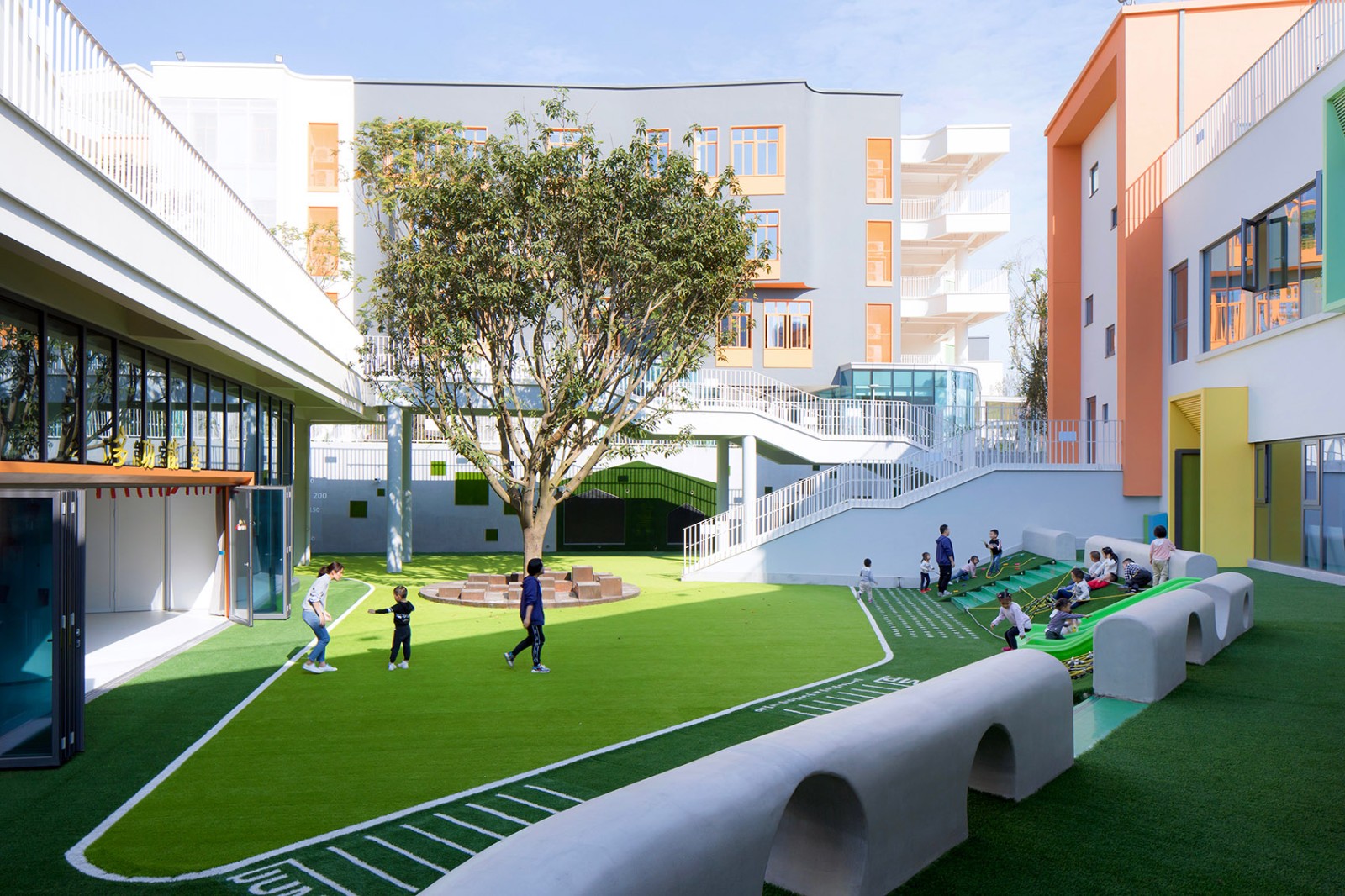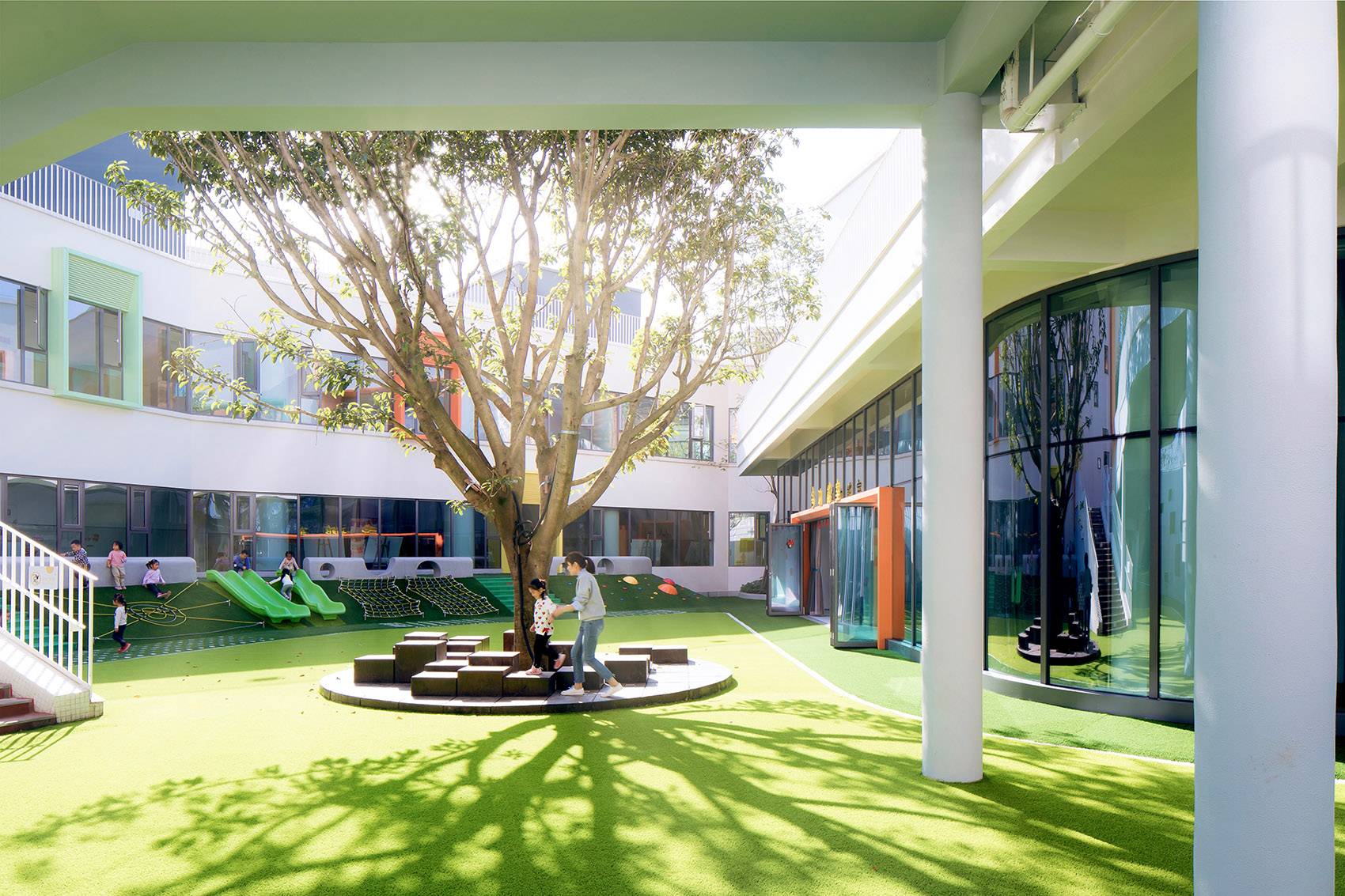 這是一個關于森林的夢想。為了孩子們的戶外生活更大程度的融于自然,設計選擇了綠色作為場所的基調色。建筑的色調還原了彩色的童年,景觀采用深深淺淺的綠,親近自然。