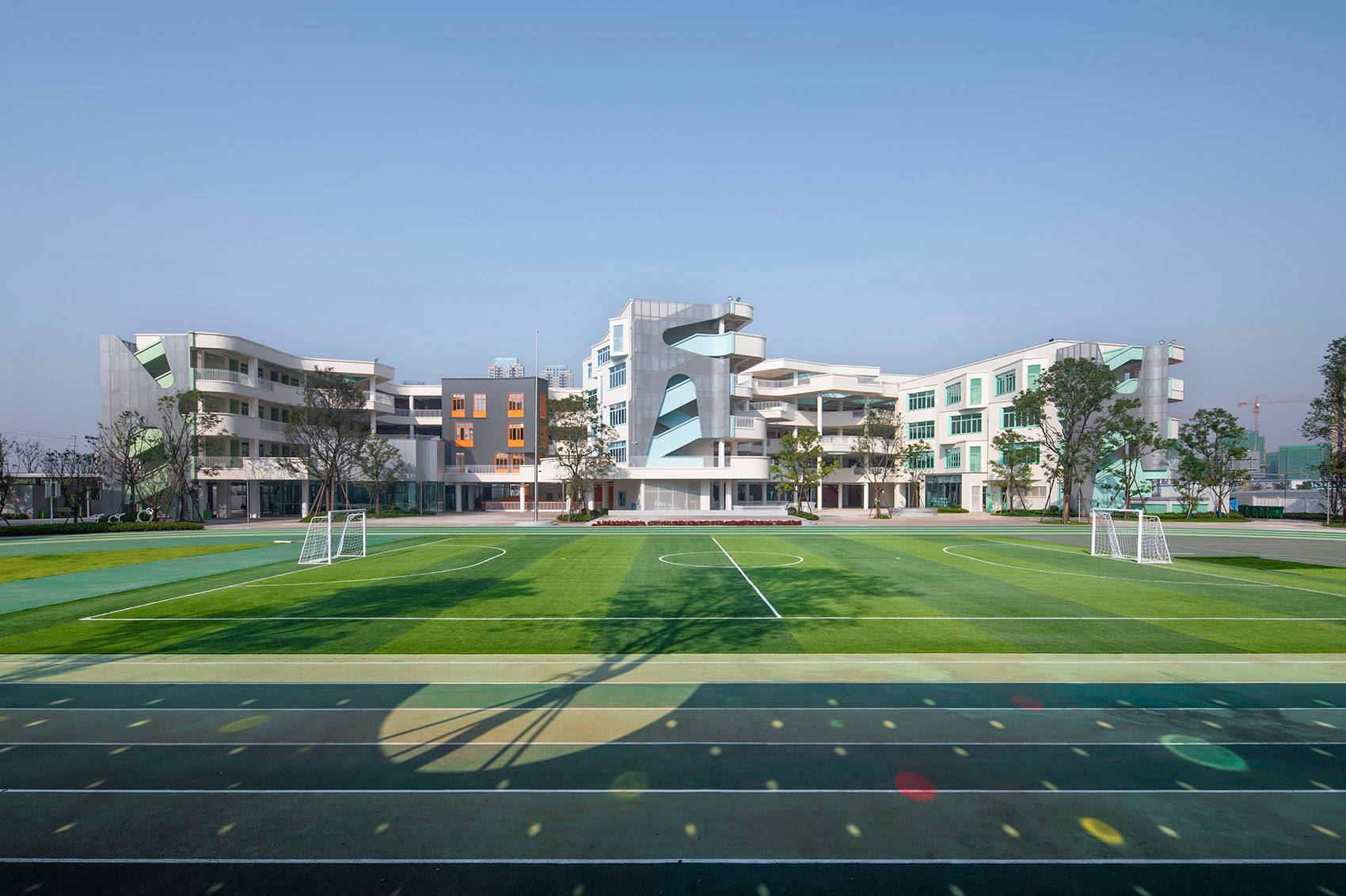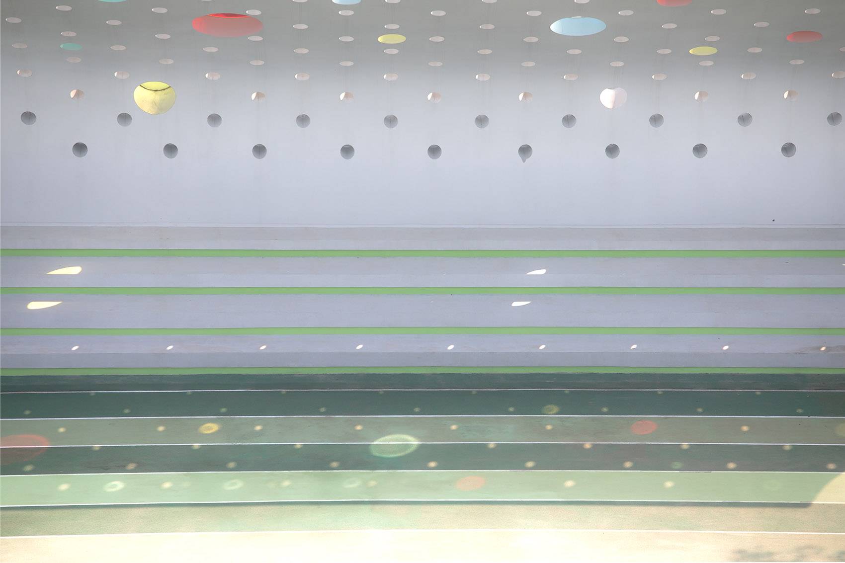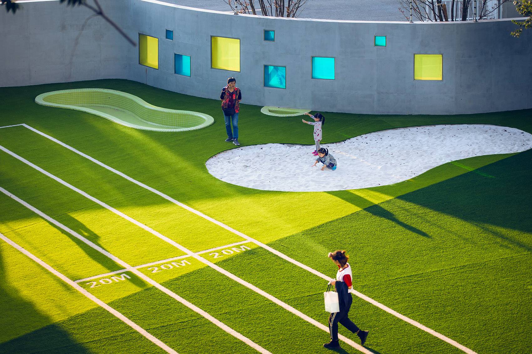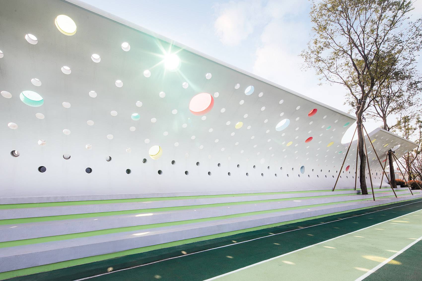 在這面弧形的墻體上嵌入大小不一色彩各異的小圓窗,每當太陽升起時,彩色的光斑印在操場上,成為一片歡樂的色彩迷宮,形成一個奇幻的三維空間。隨著太陽的高度、方位的變化,這片色彩迷宮在操場上挪移,并呈現出不同的陰影與形態(tài)。時間就這樣被變化成可以看見的語言。