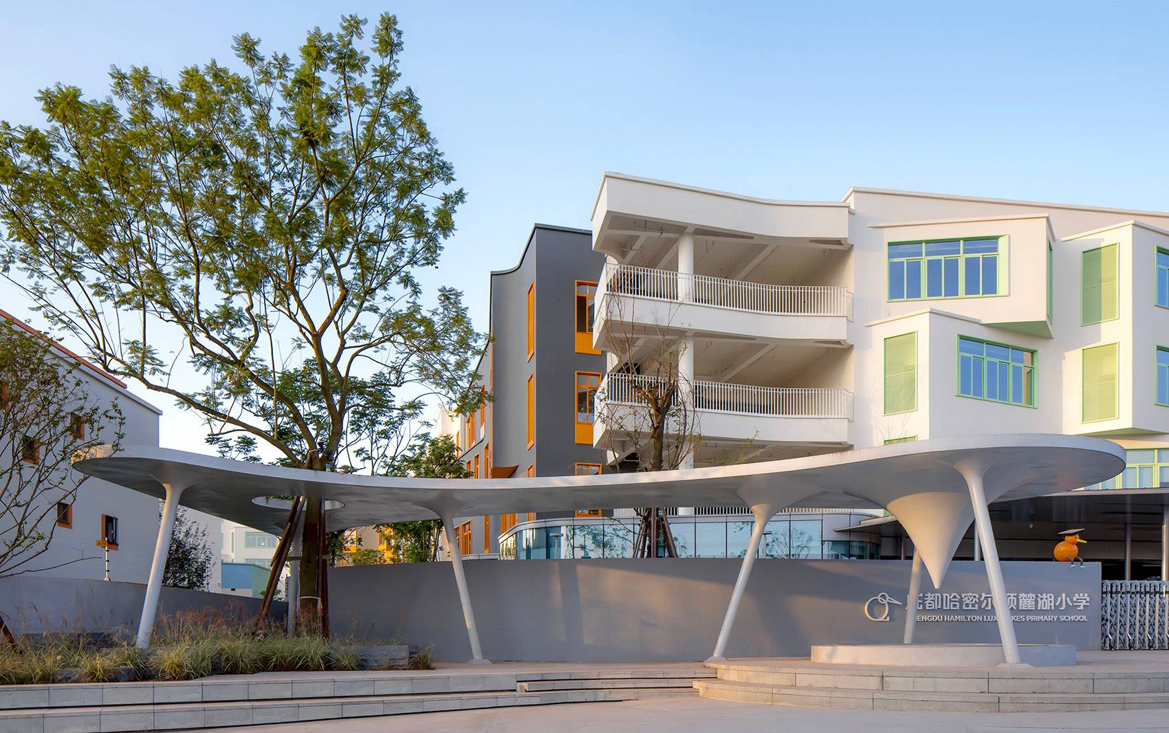 哈密爾頓學校是成都市與新西蘭哈密爾頓市合作的國際教育項目,分為幼兒園與小學。景觀與建筑設計秉持“空間即教育”的理念,通過空間上的縱橫延伸,建筑與景觀的完全融合,讓學生在校的時間和空間共同構成一個“由內而外生長出來”充滿活力的有機體,打造一處思想和學習上的無圍墻境界。