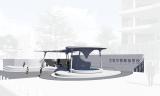 操場旁的看臺正對升旗臺,背后就是校外的人行道。設計從看臺上升起一面墻體形成與校外空間的界限,墻體向上延伸成為一個弧形的頂棚。