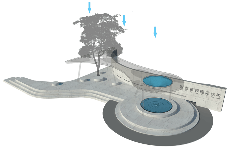 位于校園大門的裝置作品,以時空為演繹概念?!八巍被頌榕缮f物的奇異點,砵底抽象的表達了微觀宇宙,中心螺旋向下的空間,用形式語言闡述萬有引力的黑洞。時間的刻度穿梭于一個個空間循環(huán)之中。
