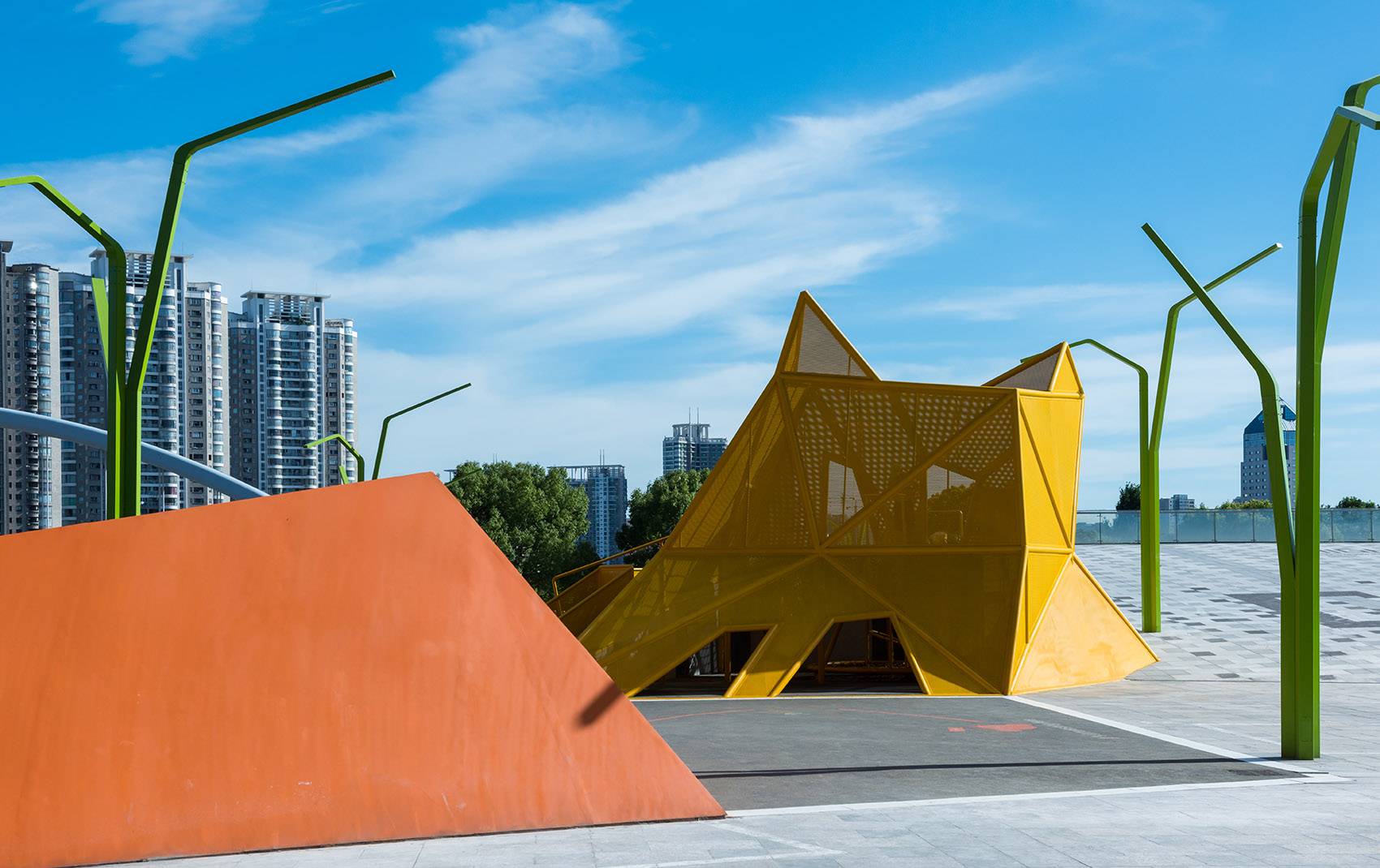 萬科把案名定義為芝士公園,并為這個(gè)公園創(chuàng)作了一位形象代言人芝士貓。我們以空間的形式,構(gòu)建了這只芝士貓,一個(gè)由鋼管和鋼網(wǎng)構(gòu)成的棱角分明的塊和面結(jié)合的大型構(gòu)筑物,有著貓咪的三角形尖尖耳朵以及大眼睛,兩只大眼睛剛好形成了滑梯下滑的出口和繩索攀爬的入口——它本身就是一個(gè)游樂場。有顏值有個(gè)性,如果還有內(nèi)涵,還有什么理由不愛上它?于是我們要芝士貓絕不只是會(huì)賣萌??徇€必須要能傳播知識(shí)才不浪得虛名。
